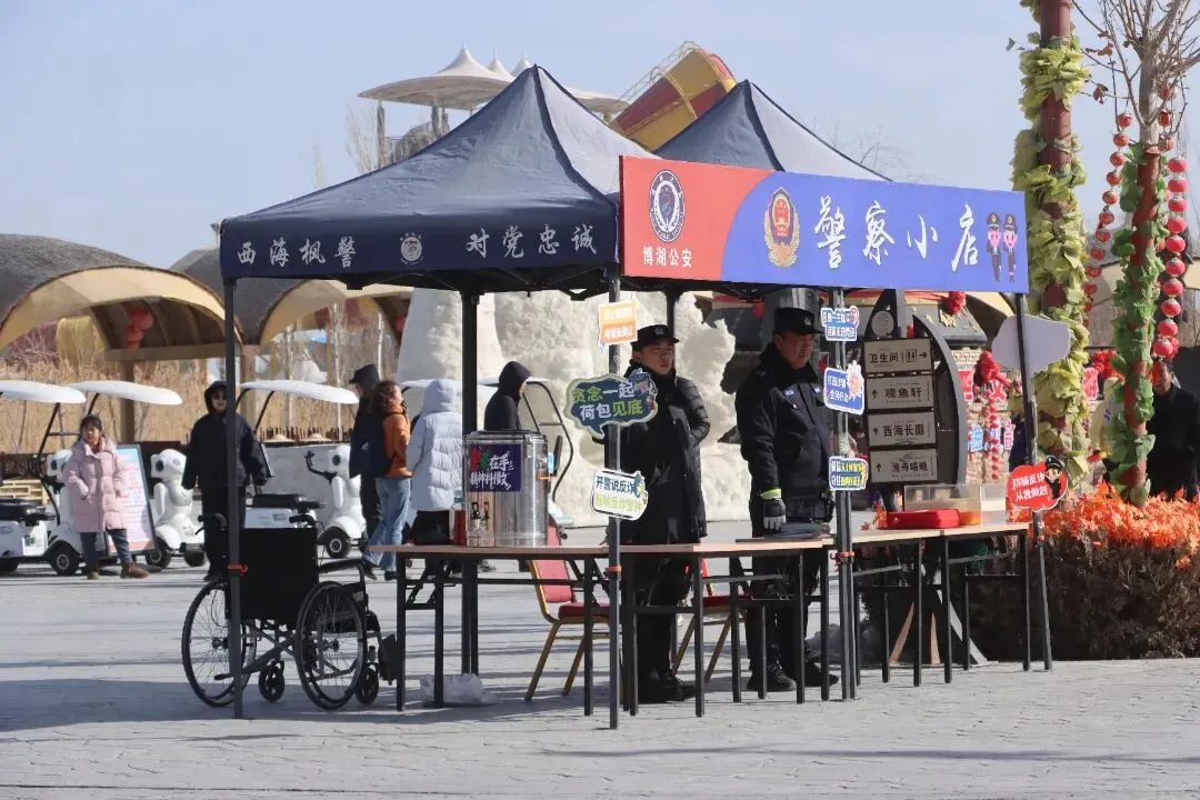 景区入口左侧的“西海枫警便民服务点”,是巡逻组的“大本营”。服务点里摆着保温桶、充电插口、急救箱、两辆轮椅。保温桶里的热水,下午已经换了三回。充电插口一直没空着,有人充手机,有人充充电宝。急救箱里备着创可贴和速效救心丸,桌角还放着几个暖手宝,游客可以拿着用。值班民警说,有人渴了来喝水,有人手机没电了来充电,有老人走累了来歇脚。下午四点多,一位中年男子急匆匆过来:“有没有创可贴?孩子在冰雕旁摔了一跤,手划了个口子。”民警从急救箱里拿出创可贴递过去。男子道谢后匆匆离开。值班民警说,创可贴用得最快,春节期间已经补了两回。