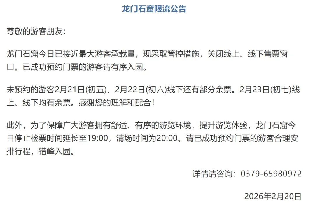 2月20日,龙门石窟发布限流公告指出,龙门石窟今日已接近最大游客承载量,现采取管控措施,关闭线上、线下售票窗口。