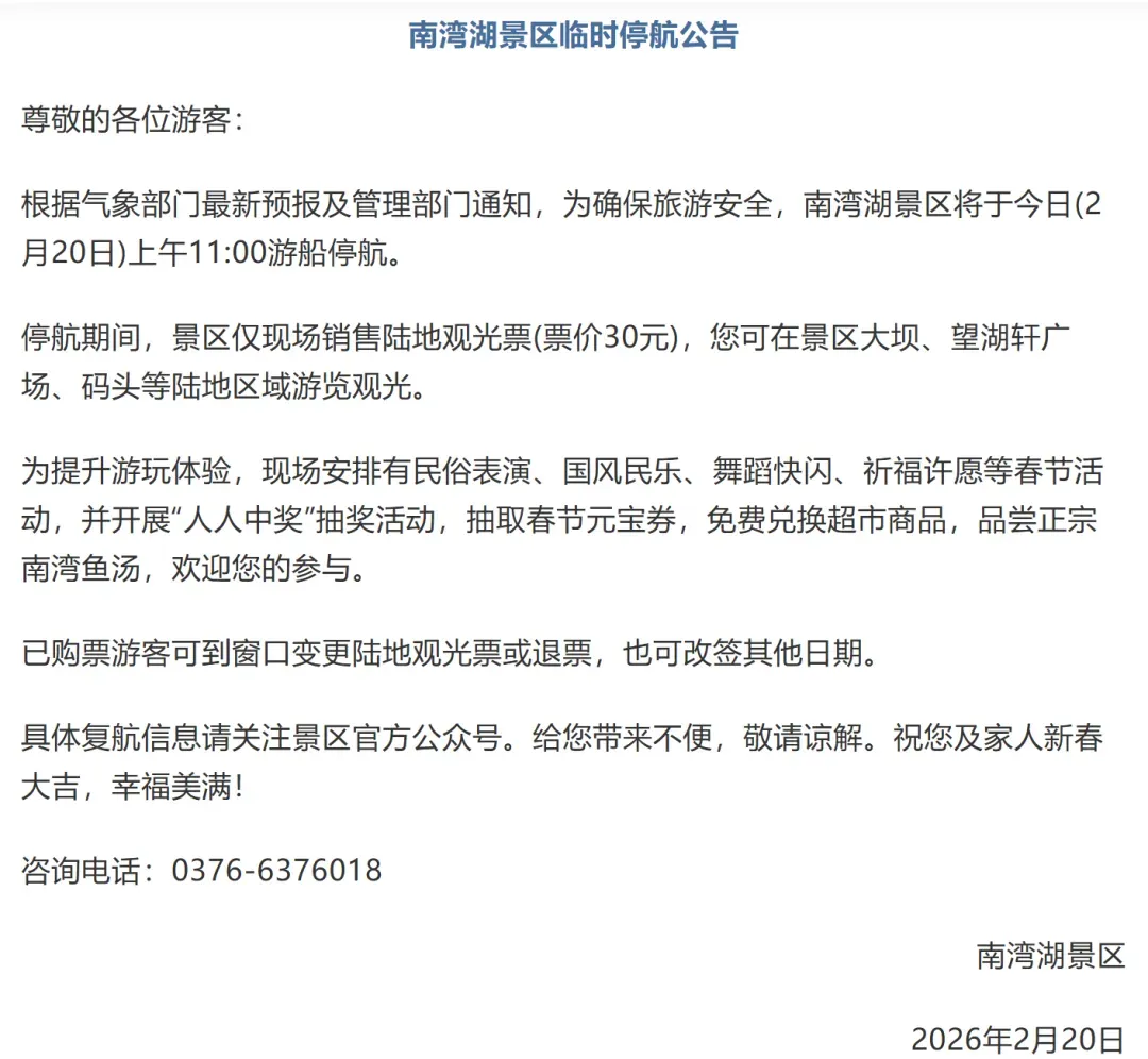 · 南湾湖 2月20日,南湾湖景区发布临时停航公告,称今日(2月20日)上午11:00游船停航。