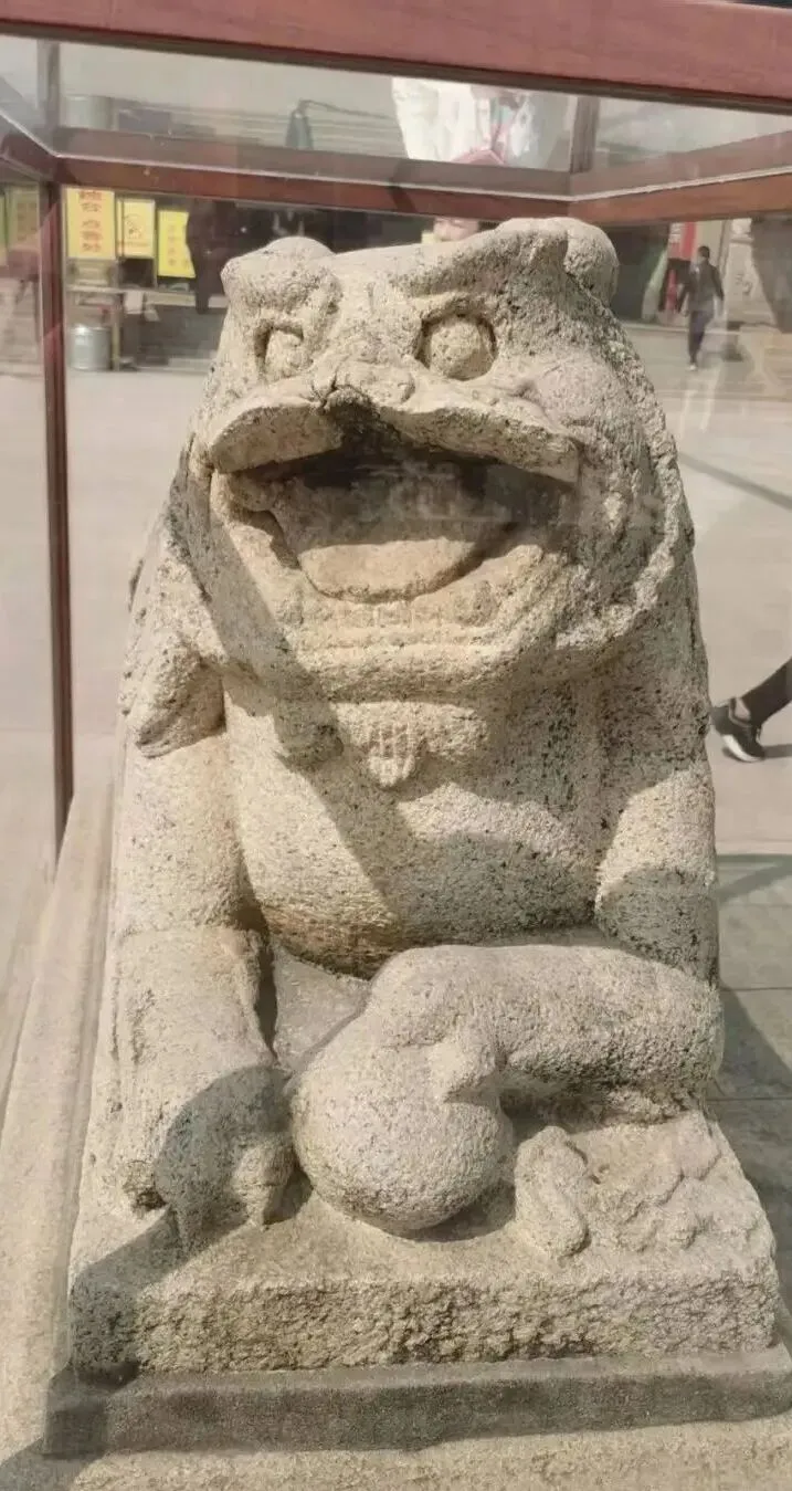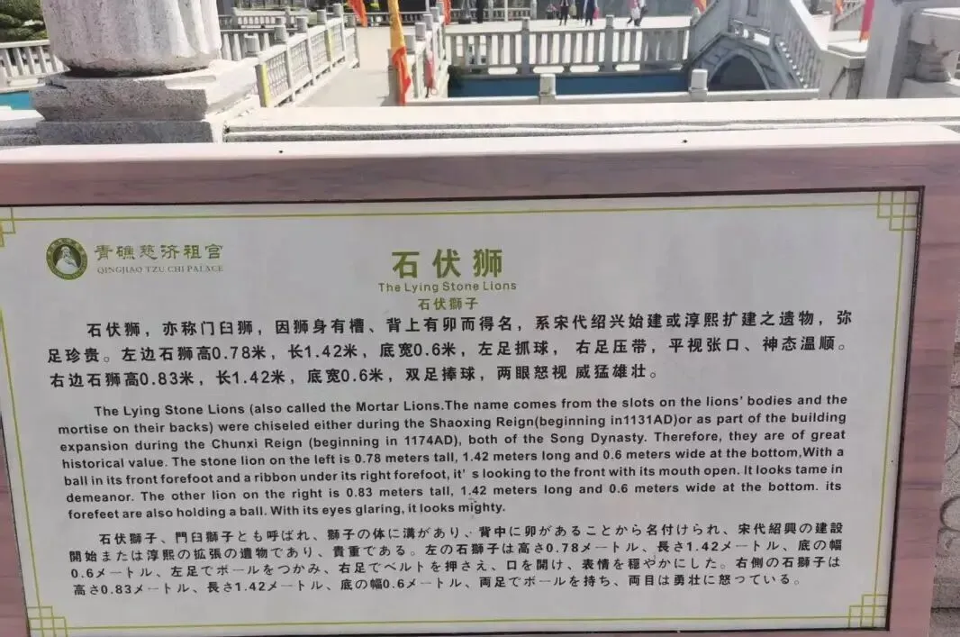 青礁慈济宫前殿宫埕两旁,有两尊宋代门臼狮,石狮呈伏卧状,狮身