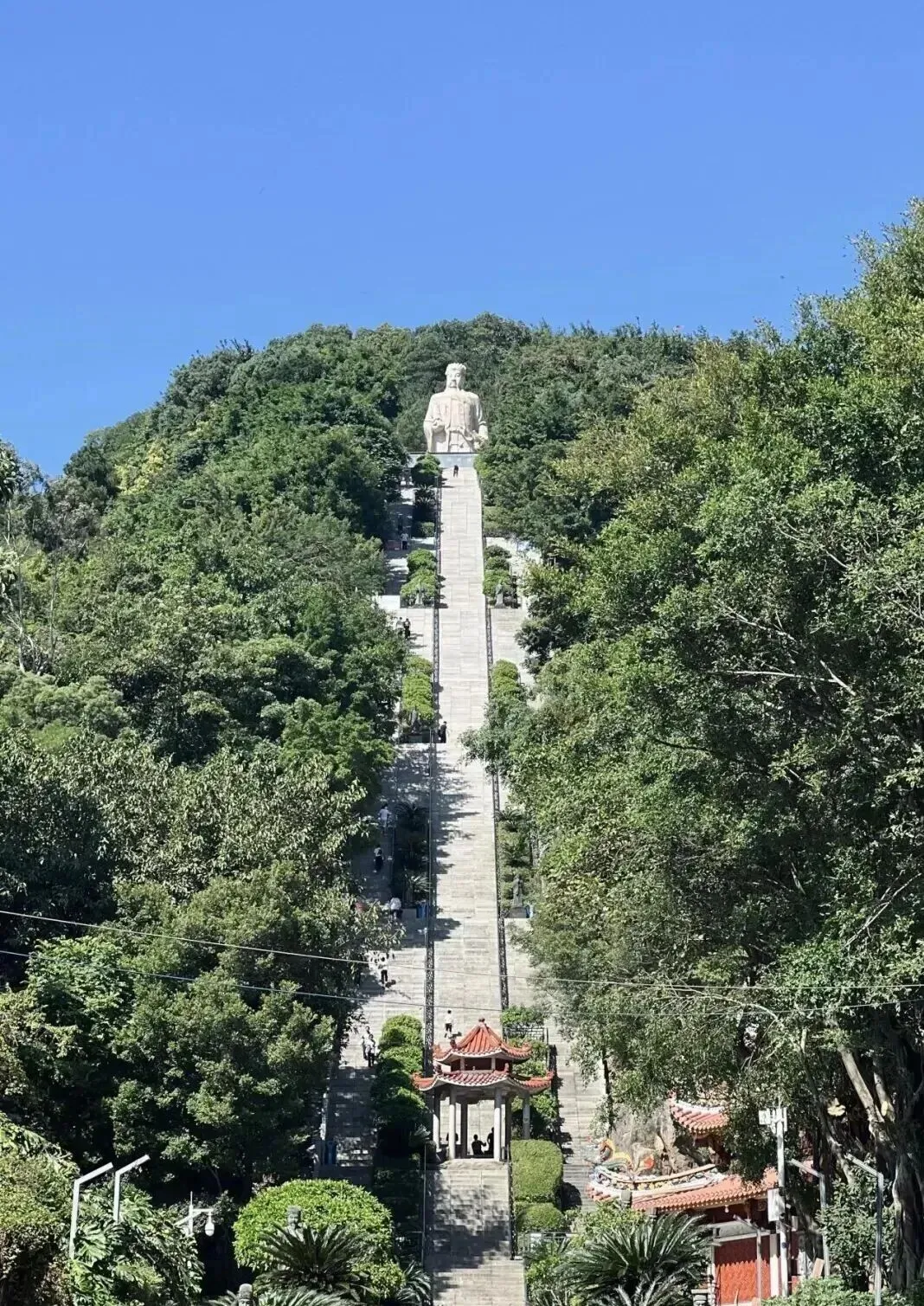 景区有811级中医长廊(天梯),两侧32尊历代名医雕像,顶端广场是的18米保生大帝青铜圣像,可俯瞰厦门湾与厦漳大桥。