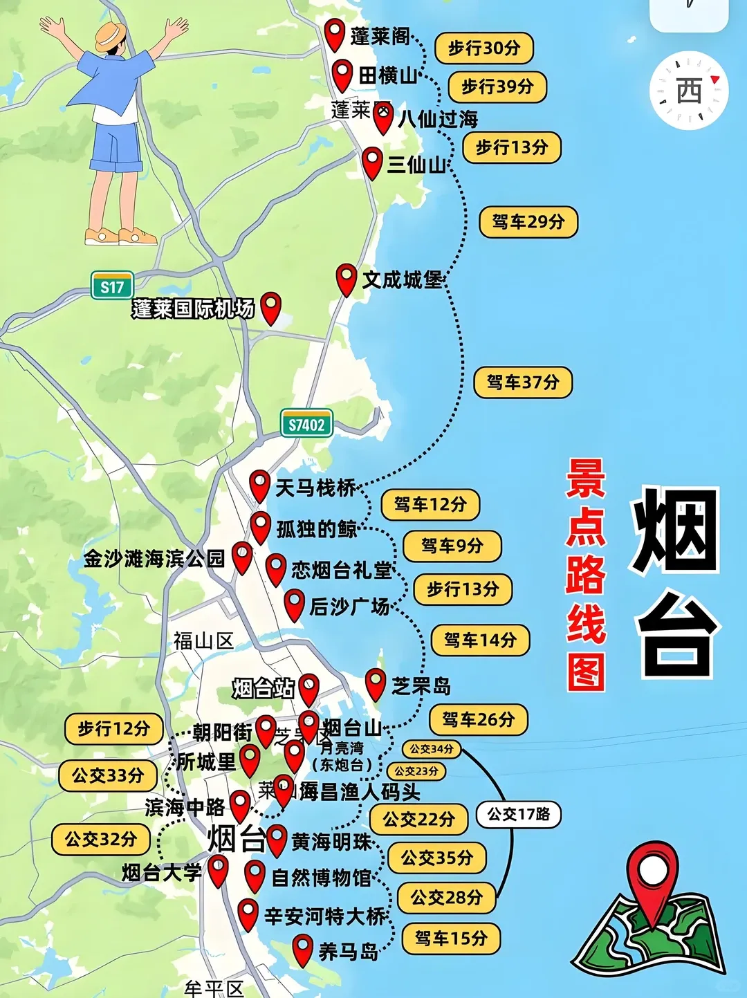 蓬莱阁、八仙过海、养马岛、烟台山、渔人码头、所城里