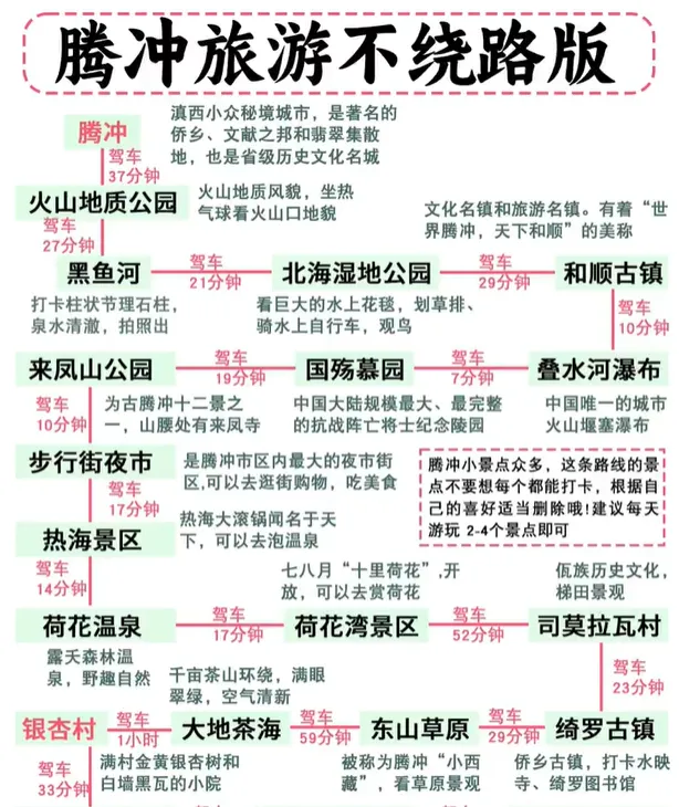 和顺古镇、热海景区、北海湿地、固东银杏村、国殇墓园、叠水河瀑布