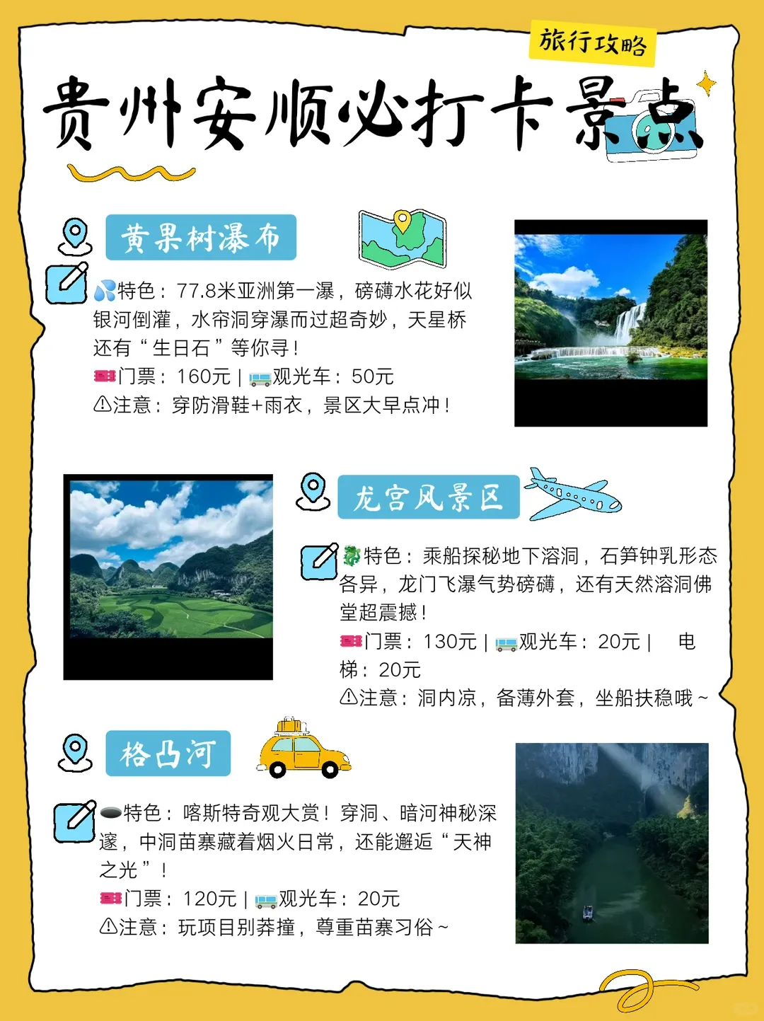 平坝樱花园、天龙屯堡、红枫湖、云峰八寨、龙宫景区、黄果树瀑布