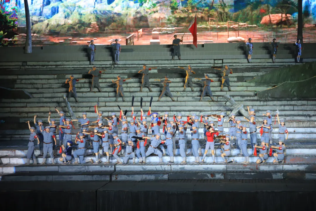 演出以自然山水为幕,依托2400个动态座椅,矩阵式移动舞台,结合裸眼3D、激光特效、真实爆破、高空威亚及全景多媒体系统,使观众在超过50米的移动观演中沉浸式融入剧情。