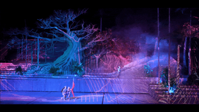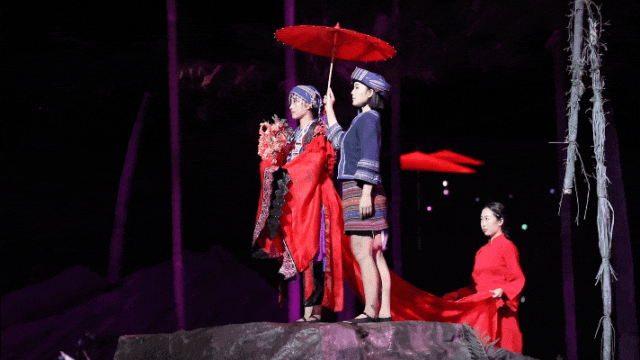 舞台场景高低起伏,通过多维组合与灵活变换,生动再现了海南的原始丛林、起伏山川与原始村落,使观众在行进中感受历史的流动与情感的跌宕。