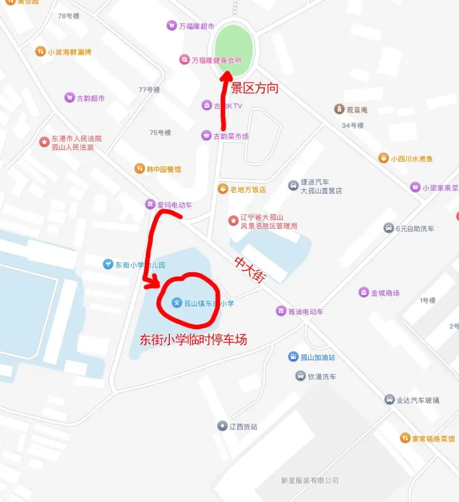 3、东街小学临时停车场:高德导航搜孤山镇东街小学,腾讯导航点下图。