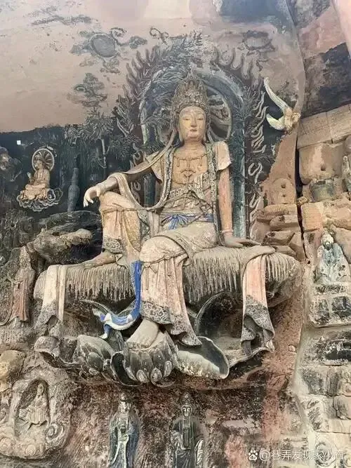 被誉为 “东方维纳斯” 的“水月观音”(紫竹观音)便在此处。雕像侧身翘脚,姿态自在优雅,衣袂翩跹,将宋代石刻的世俗化与艺术性展现到极致。