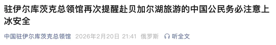近期,贝加尔湖气候异常,冰面情况异常复杂。近日接连发生中国公民在贝加尔湖冰面伤亡事故,教训极其惨痛。我馆再次紧急提醒赴贝加尔湖旅游的中国公民务必注意上冰安全: