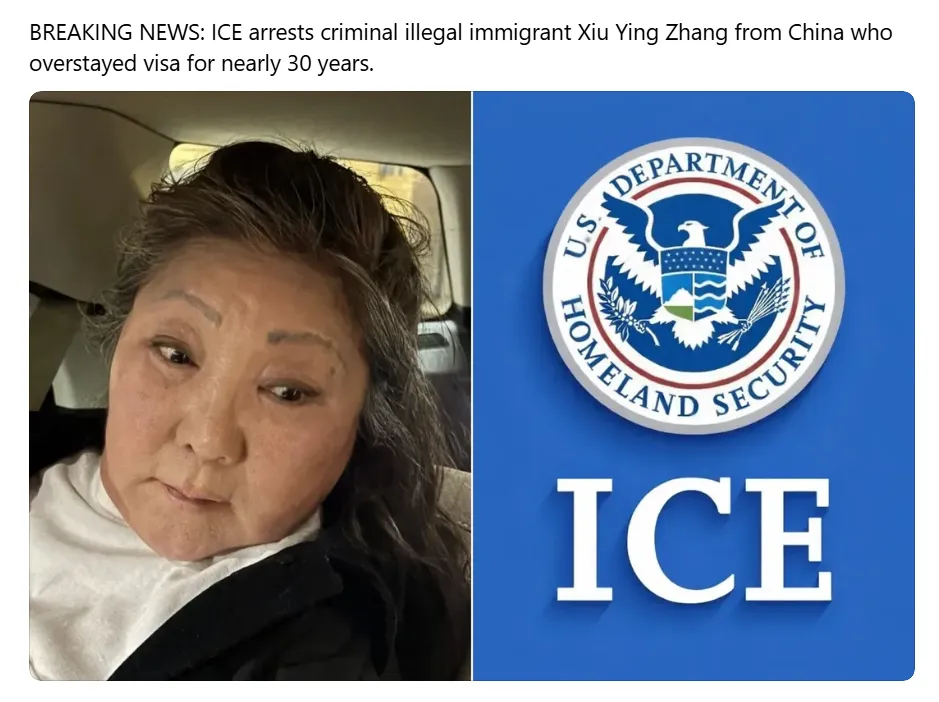 美国移民暨海关执法局(ICE)波士顿办事处18日通过官方X帐号宣布,该办事处于17日逮捕了一名在美非法居留近30年、且拥有多项犯罪纪录的中国籍女子张秀英(Xiu Ying Zhang,音译)。该女子在1996年合法入境美国后滞留不归,期间并涉及多项色情与人口贩运罪行而遭刑事指控。