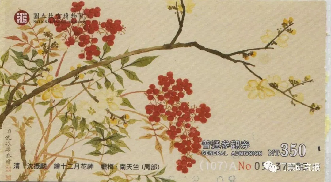 当天下午还参观的著名的台北故宫博物院,这是所有到台湾的游客们“打卡”之地。馆中收藏着各类文物珍宝约65万件,素有“北京故宫看建筑,台北故宫看文物”的说法。台北故宫原称中山博物院,为台湾省规模最大的博物馆。台北故宫门票全价为350元新台币(约合78元人民币)学生、青年及旅游卡150元新台币,台北故宫实行团队预约。我们属团队由台湾导游在售票处集体办手续,个人没有门票。在参观过程中见到有几位台湾学生手中拿着门票,就试探地询问门票是否有用,学生知道笔者收藏门票就高兴的赠送了。台北故宫门票小巧玲珑、古色古香,主图是清代画家沈振麟绘《十二月花神-腊梅》,以及售价及流水码,背面以馆徽为衬底门票使用须知。