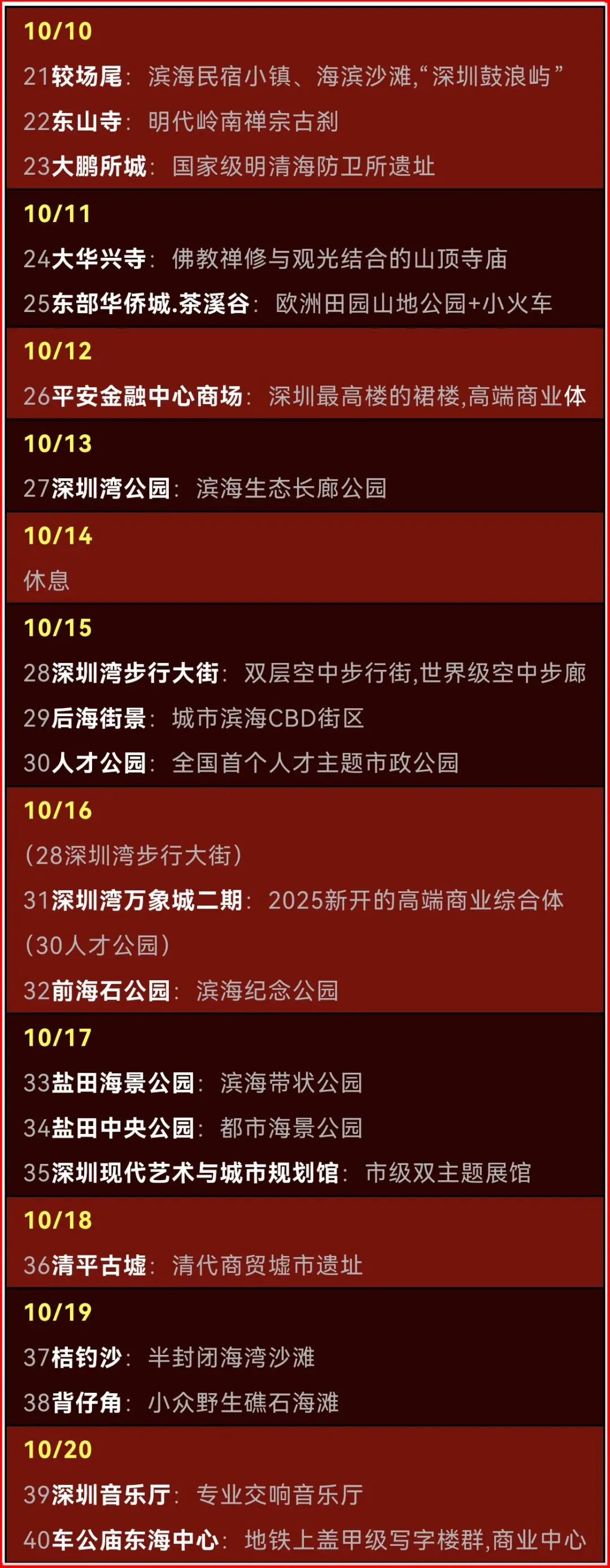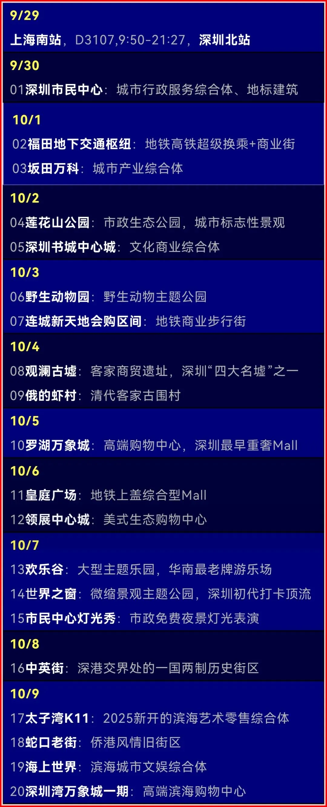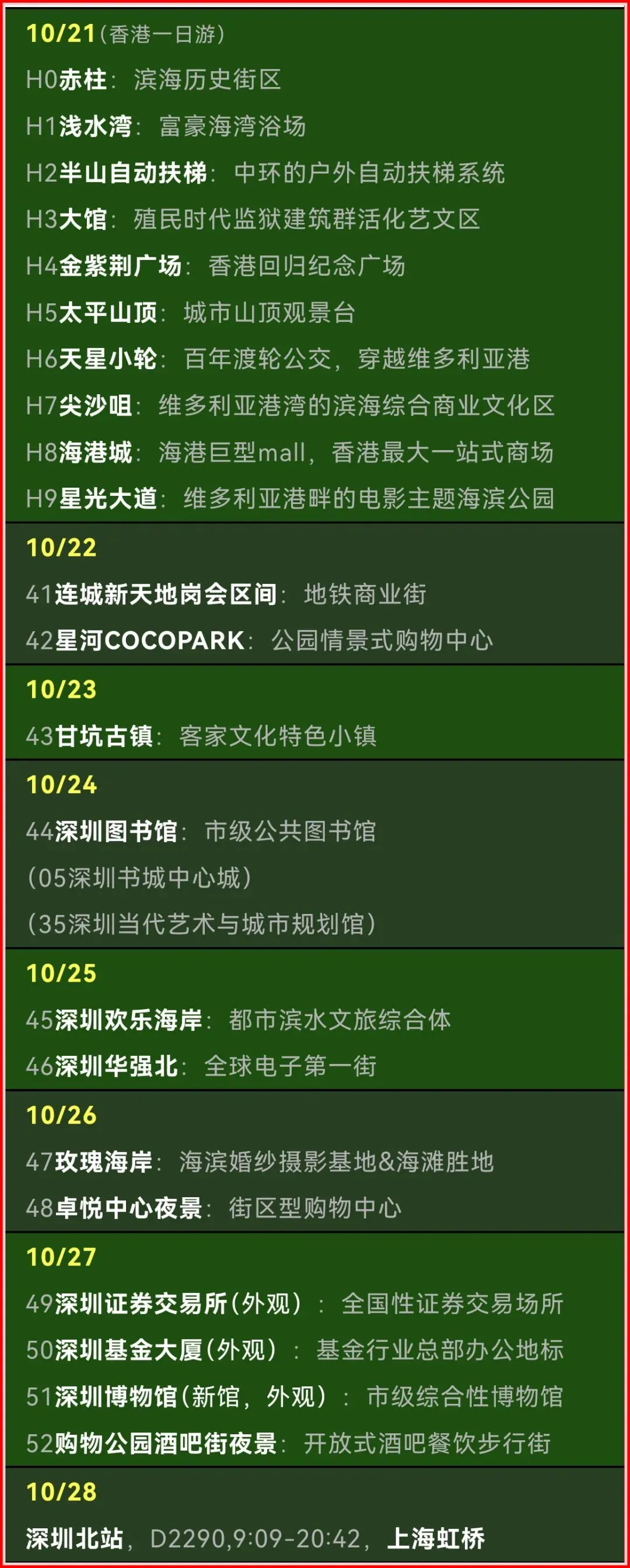 2025年的秋天,即将返回新加坡的小女儿一家,邀请我们来到深圳,在她家居所(福田香格里拉酒店商务公寓)旅居一个月。期间,我们到处走走看看,先后到过的景点或地方有综合公园、专题乐园、海滨沙滩、古镇老街、禅寺庙宇、商圈店街、文娱场馆等等,一共是62个,其中深圳52个、香港10个,以下就编成简表,作为这一段美好经历的纪念。