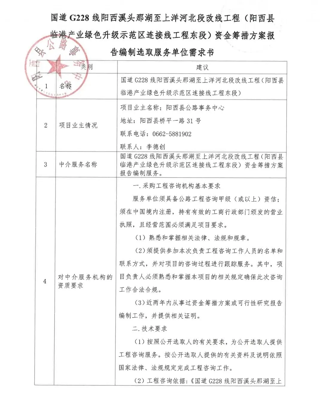 【导读】2026年2月10日,国道G228线阳西溪头那湖至上洋河北段改线工程(阳西县临港产业绿色升级示范区连接线工程东段)公开选取【工程咨询】。根据行业主管部门对项目工程可行性研究报告的审查意见,编制本项目资金筹措方案,并取得相关部门的批复。(如果本栏目内容与采购需求书不一致,以采购需求书为准)据了解此线路也属于广东滨海旅游公路,连接广东滨海旅游公路阳江港大桥段,具体以实际为准。