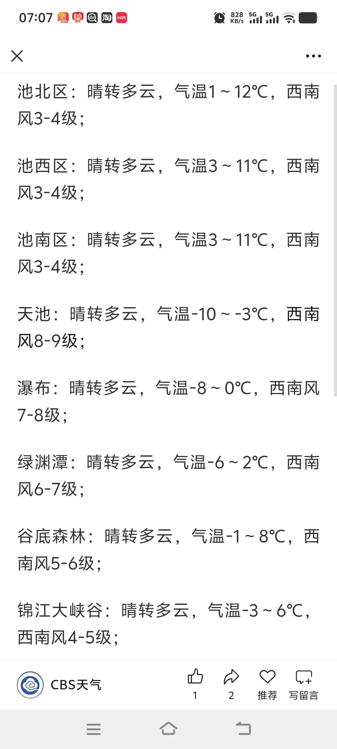 ➡️北景区风力较大,不具备安全运营条件,2月21日北景区全天关闭。 ➡️西景区主峰,风力8-9级,公路积雪结冰,不具备安全运营条件,天池景点全天关闭。粉雪谷、锦江大峡谷景点,正常开放,视天气情况随时关闭。 ➡️南景区关闭。