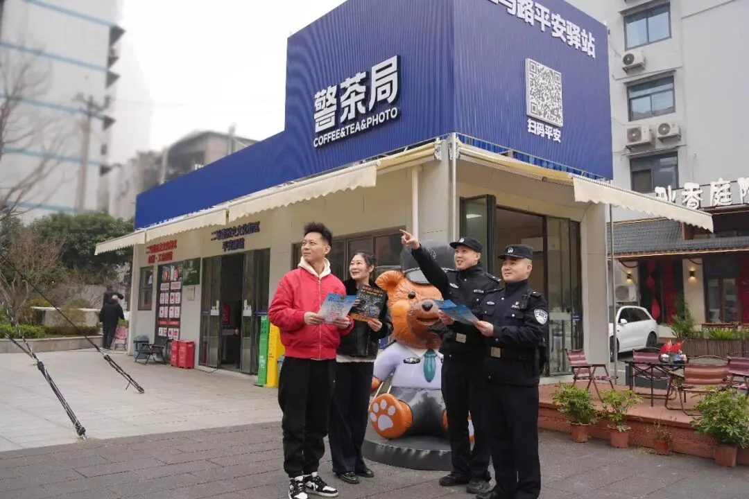 转过街角,一处挂着“警茶局”的小屋格外引人注目。这不是新开的茶饮店,而是二马路警务室推出的创新服务点。屋内,民警正将一杯热茶递给游客,并耐心进行反诈宣传和安全旅游提示,“警茶局”里,便民药箱、充电设备、雨伞一应俱全。墙上贴着反诈宣传漫画,桌上摆着安全手册。几位游客正围着民警咨询路线,民警手持地图细致讲解,还不时用笔标注。
