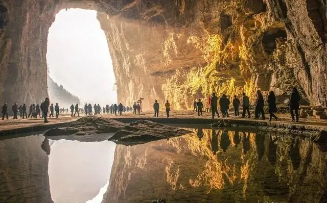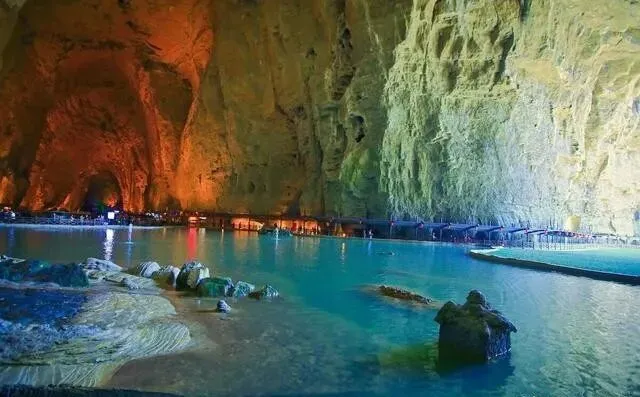 亚洲最大溶洞!全长近50公里 , 目前才开发了六公里。 入口处江水直接扑进暗河 , 那个声响 , 震得心跳加速。 洞里能坐电瓶车 , 还有民族风情表演 , 温度很低 , 记得带外套哦