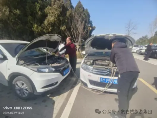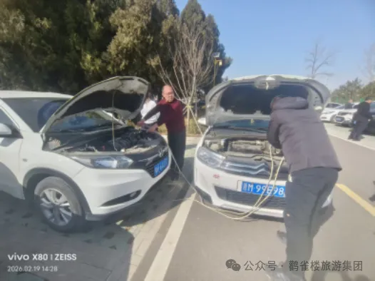鹳雀楼景区一辆游客车辆电瓶故障,工作人员李晓辉发现后安抚游客,迅速联系工程部刘志国、冯沛,5分钟内完成应急救援,车辆成功启动,游客连声道谢。