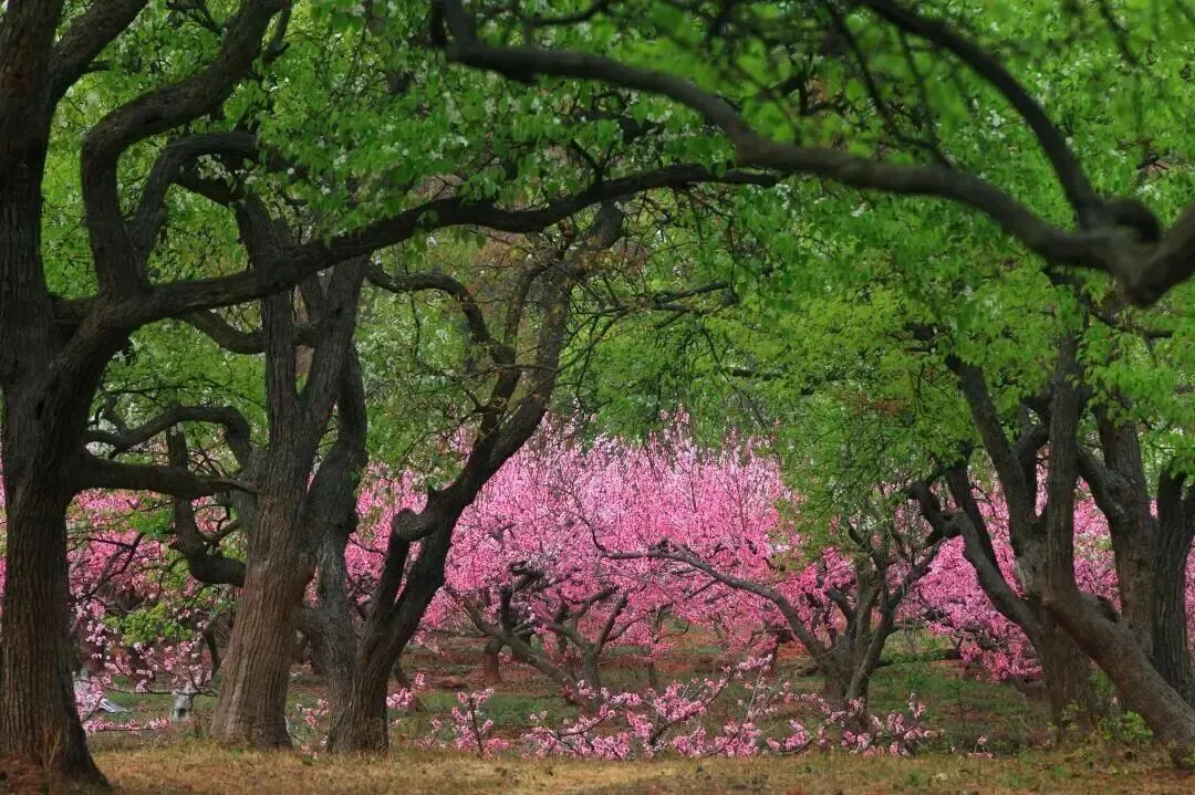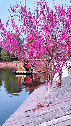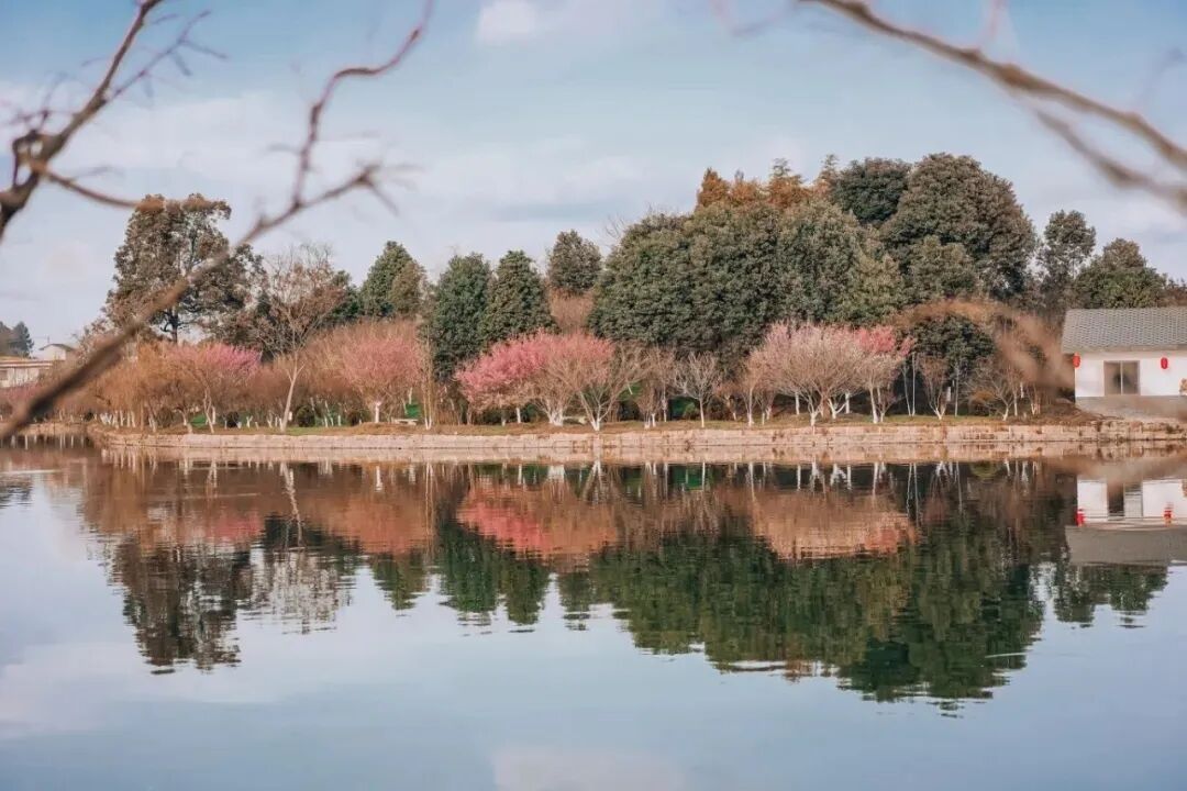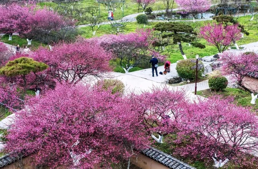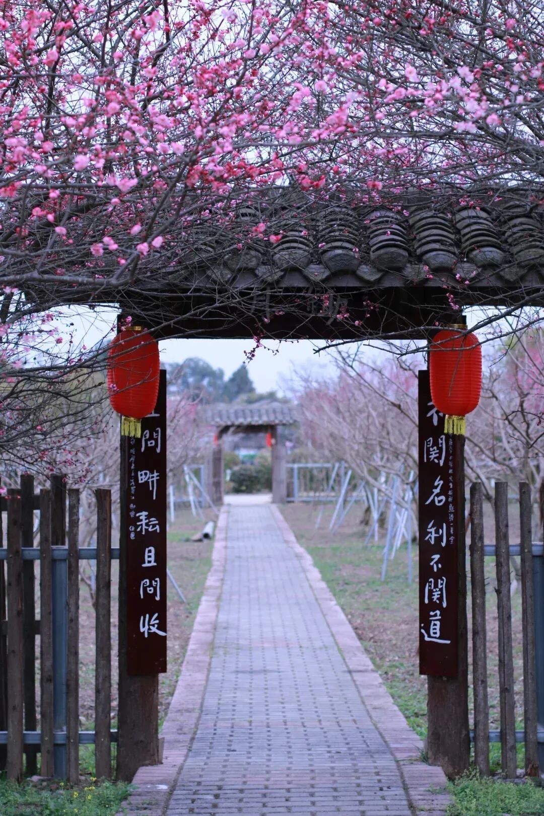 此时,漫山的红梅与山野田园相映,花开正盛,正是赏花游玩的好时节。古色古香的亭台水榭、清雅的小桥流水,构成一一幅幅如诗如画的景致。