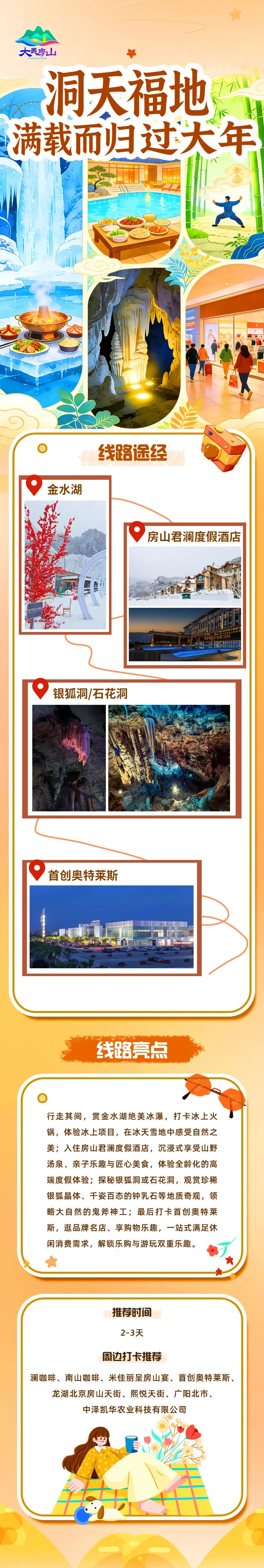 线路途经:金水湖→房山君澜度假酒店→银狐洞/石花洞→首创奥特莱斯