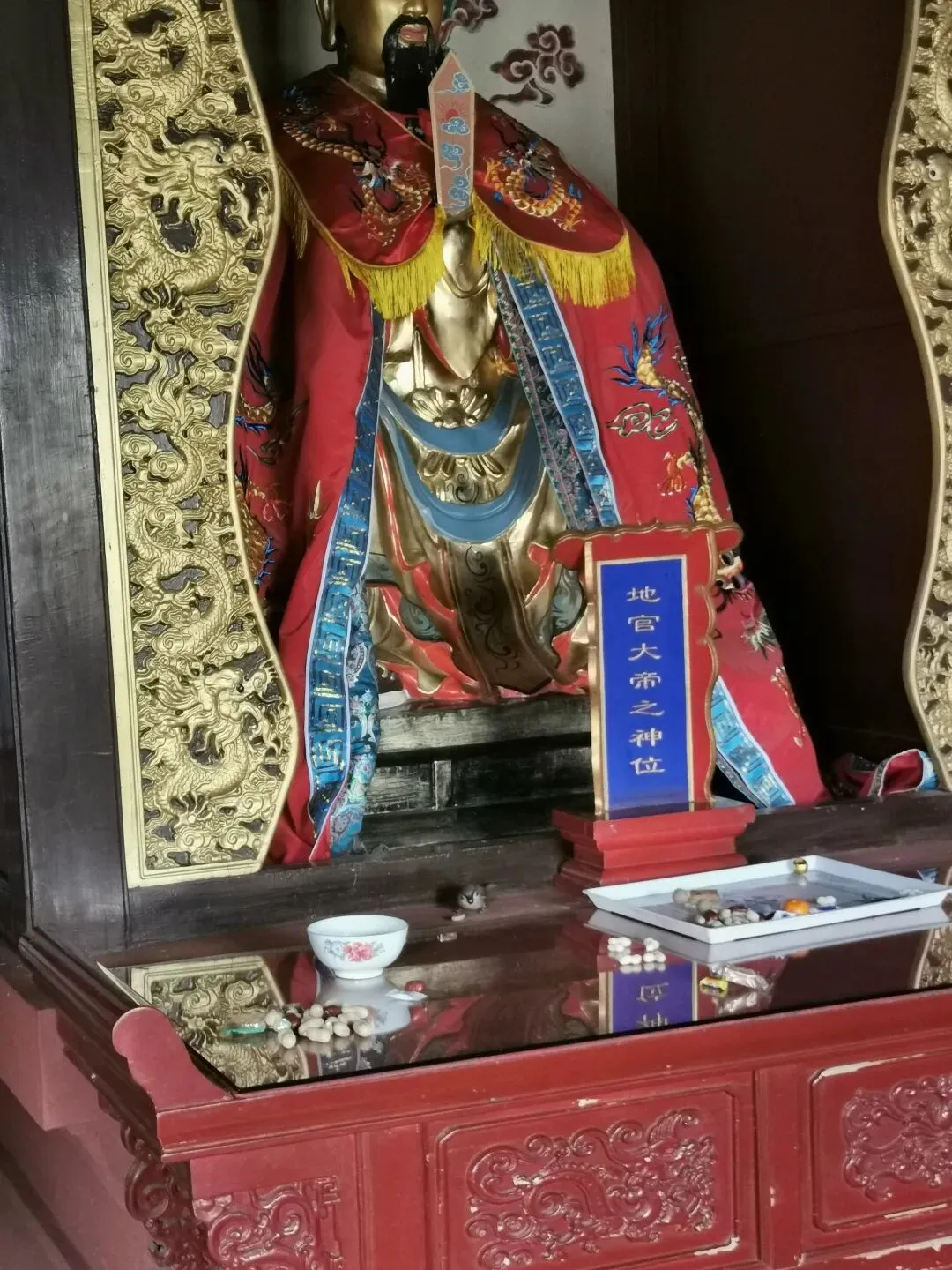 虽然老君堂不设功德箱,但挡不住信男信女的虔诚,不知谁往供桌前吊床一样的的大红布上放了第一枚硬币,这里就成了信徒自设的功德箱。正巧在西配殿看到有人在收这些钱,还专门带了块大磁铁。