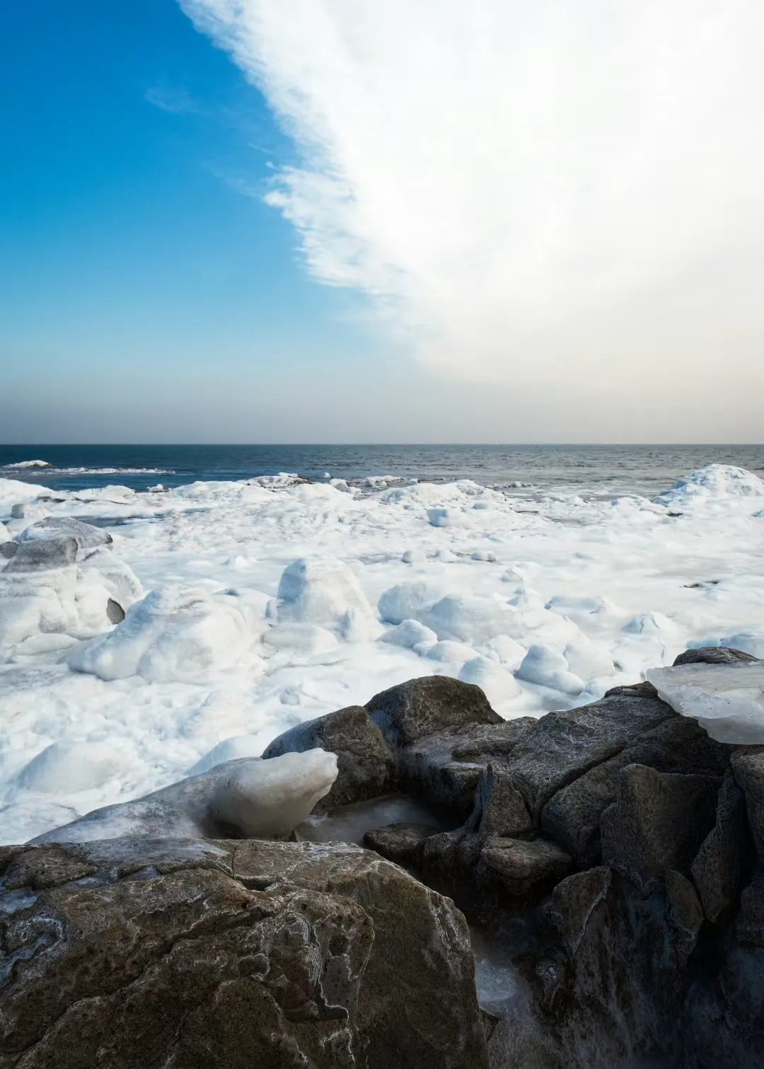 风大时,海浪被冻成层层叠叠的冰浪,冰挂、冰礁、蓝冰成片,阳光一照,晶莹剔透,像走进了冰河世纪。