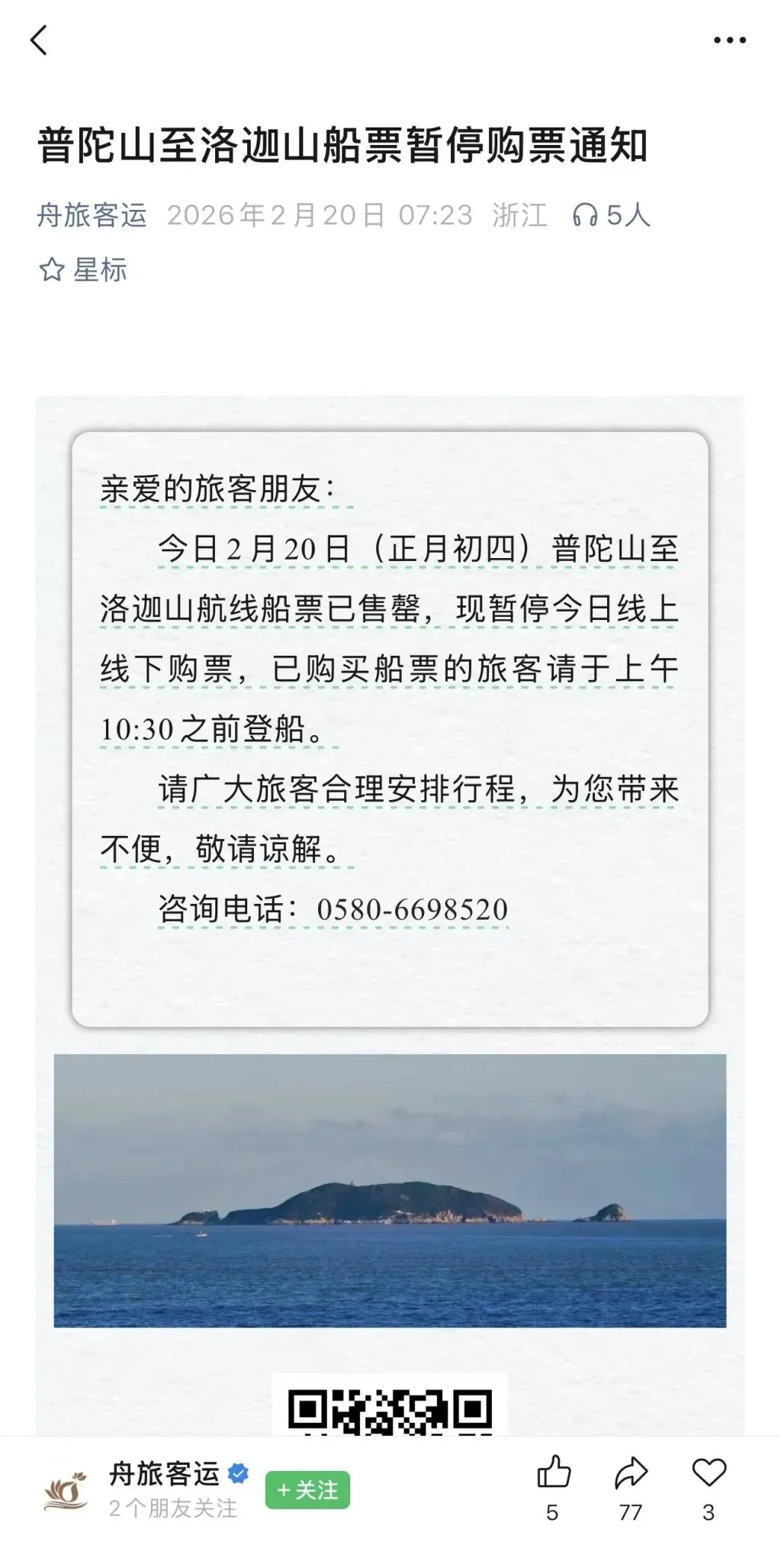 有的景区放缓游客进入速度、有的景区启动游客暂停入园措施、有的景区暂停园区内的观光车,甚至还有停船的。当日一早,舟山客运就发布消息称,当日普陀山之洛迦山航线船票已售罄,暂停线上线下购票,已买船票的旅客请于上午10:30之前登船。