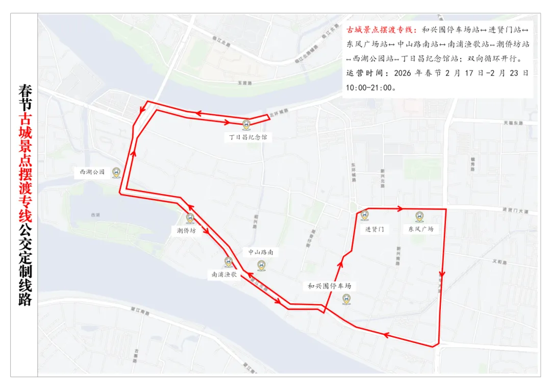 本次对首发(终到)古城区域进贤门站的常规公交线路,采取临时绕行“进贤门站”措施,改为首发(终到)“和兴围停车场站”(东环城路与望江北路交界处,距离进贤门城楼约600米)。乘坐相关公交线路前往古城区域的市民旅客,可选择在“汽车总站”或“和兴围停车场站”等公交站点下车。