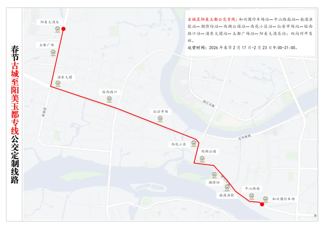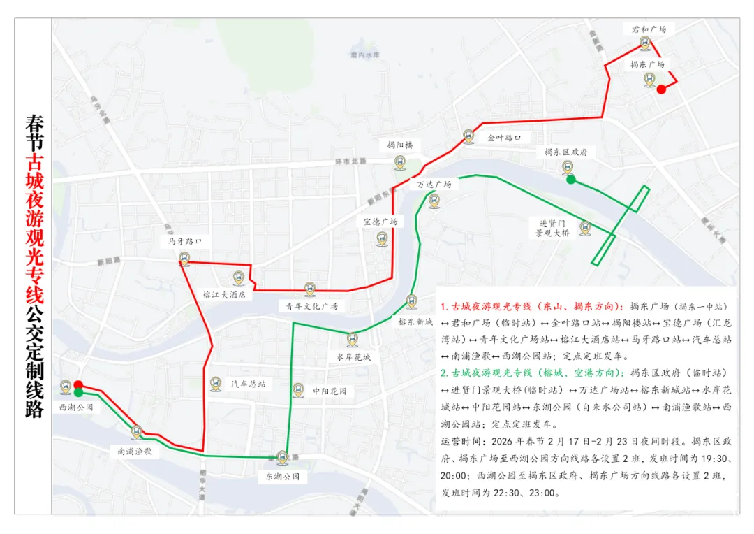 ◎运营时间:2026年春节2月17日-2月23日夜间时段。揭东区政府、揭东广场至西湖公园方向线路各设置2班,发班时间为19:30、20:00;西湖公园至揭东区政府、揭东广场方向线路各设置2班,发班时间为22:30、23:00。