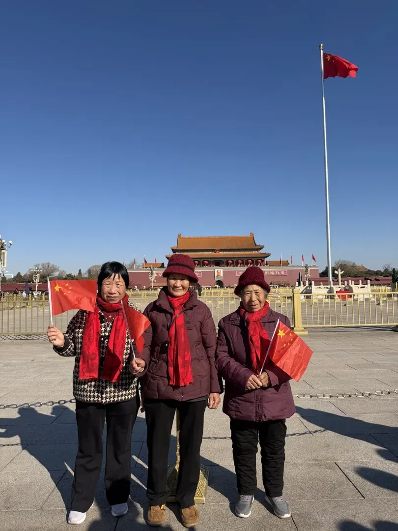 郁章宝 供图 腊月二十八一大早,一行15人从山东出发,28座的大巴车里,一路欢声笑语。腊月二十九除夕和大年初一,北京的多个景区见证了一家人的团圆年。长城、鸟巢、水立方、前门、天安门、故宫、天坛……每天的步数至少两万步。 在天安门广场,郁章宝妈妈、小姨和舅妈一路感慨,眺望天安门城楼和红旗。“北京是祖国的首都,哪怕我妈妈从小在乡村长大,她也一直觉得,这里和我们有着千丝万缕的联系。”郁章宝特意找了角度给她们一一拍照,晴朗的天空下红旗招展,画面中的人格外开心。这几张照片可以说是他的“得意之作”,“回家都要好好保存,这是我永远的财富。”