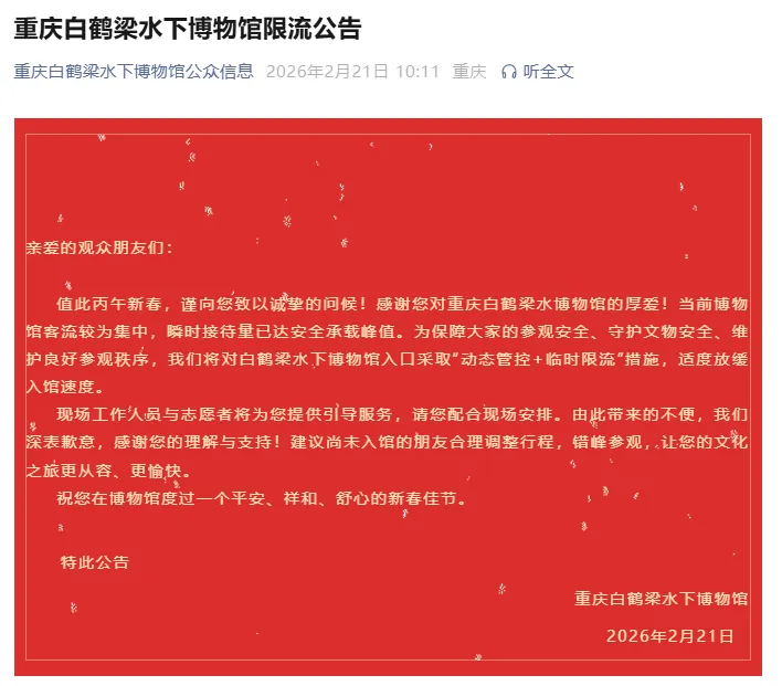 当前博物馆客流较为集中,瞬时接待量已达安全承载峰值。为保障大家的参观安全、守护文物安全、维护良好参观秩序,将对白鹤梁水下博物馆入口采取“动态管控+临时限流”措施,适度放缓入馆速度。