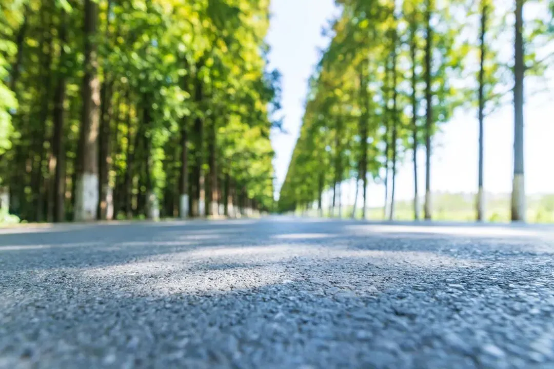 公路两边笔直的水杉树挺立,郁郁葱葱,树冠交织成一片翠绿的穹顶,只留下柔和的微风。
