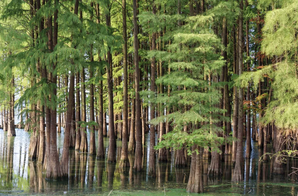青西郊野公园位于青浦区西南部主要景观有水上森林、杉林鹭影、青韵野径、湿地湾堰、水漾湿地、永静庵、芦雪迷踪等,其中60多亩的水上森林上海独有,被誉为“池杉奇观”。