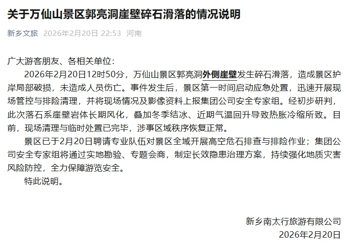 2026年2月20日12时50分,万仙山景区郭亮洞外侧崖壁发生碎石滑落,造成景区护岸局部破损,未造成人员伤亡。