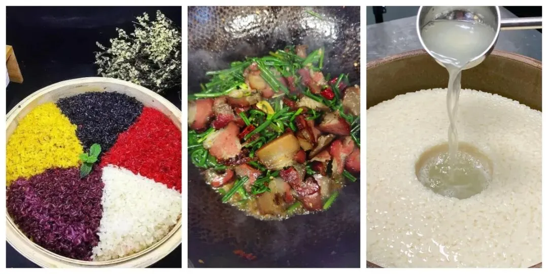 布依族五色糯米饭、腊肉炒蕨菜、糯米酒、野生菌汤