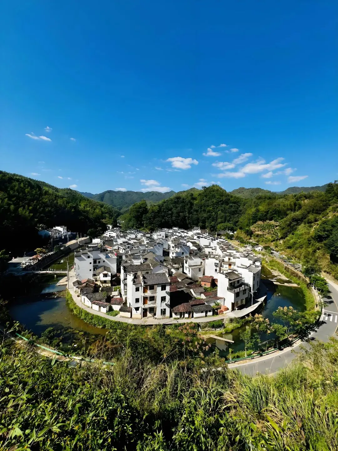 菊径河观景台、百年古廊桥、徽派建筑群、河畔古樟树