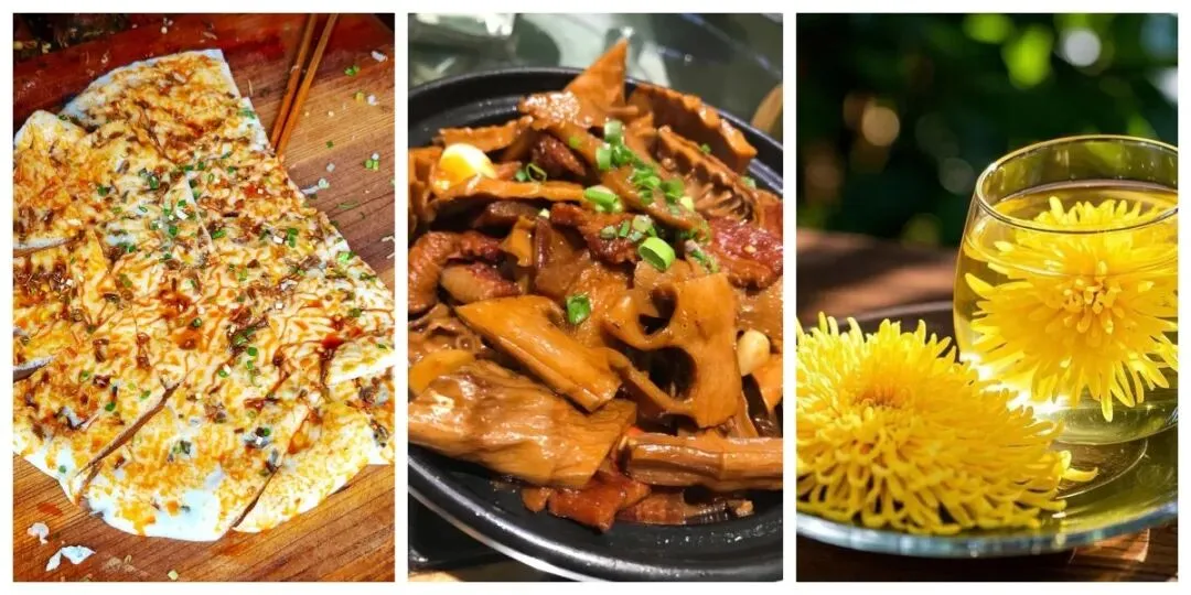 汽糕、荷包红鲤鱼、笋干烧肉、皇菊茶