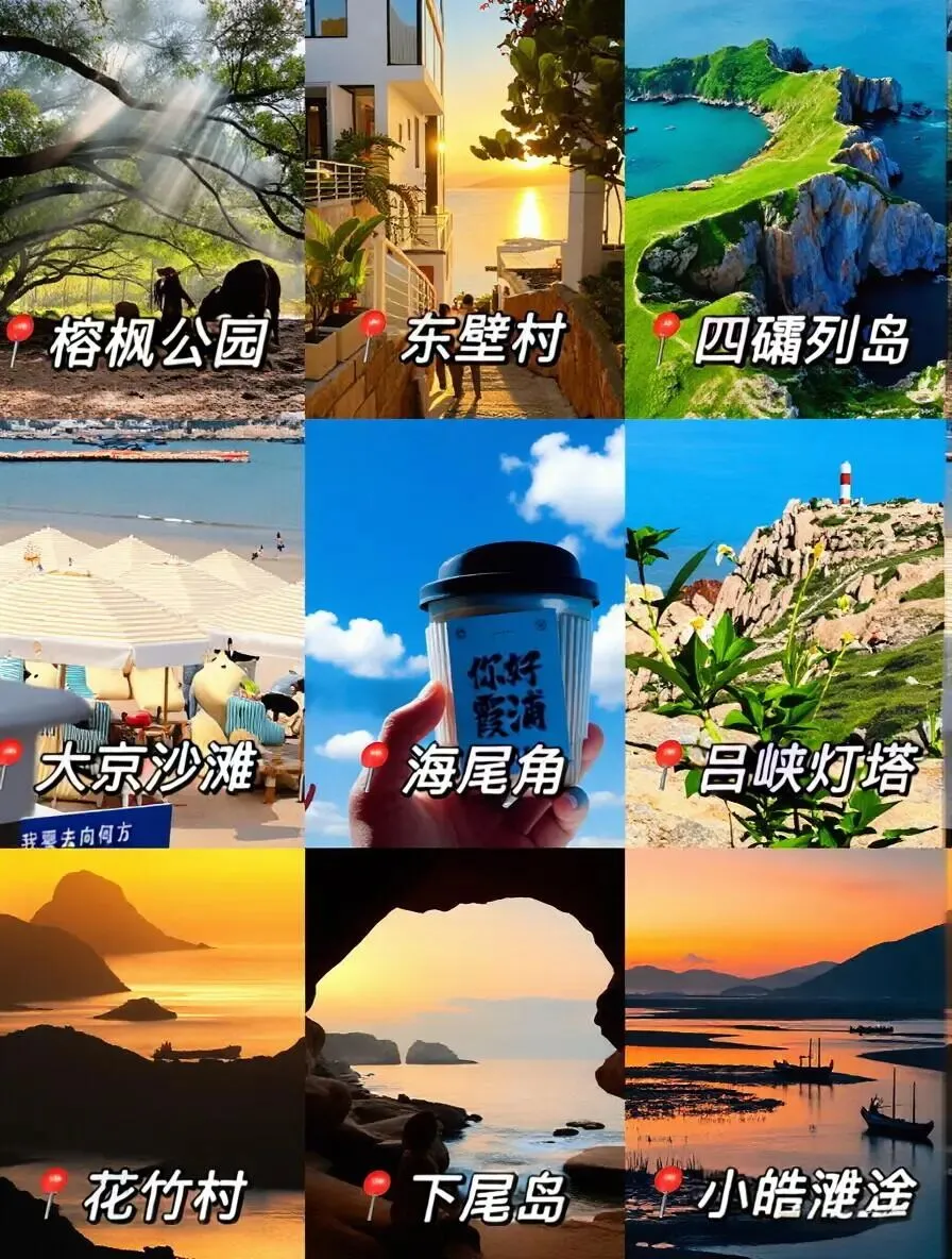 北岐滩涂、渔民劳作场景、海蚀地貌、日出观景点