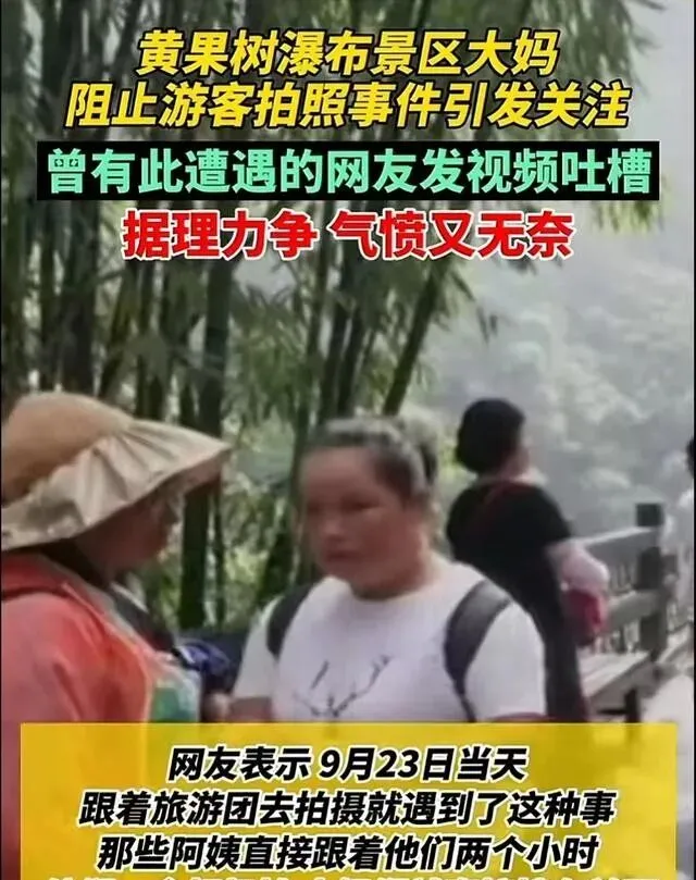 不是个例 , 好多游客发了视频 , 只要你背着相机出现在瀑布附近 , 这些经营付费拍照的大妈就会凑过来 , 甚至直接站你镜头前面挡着 , 不让你按快门。