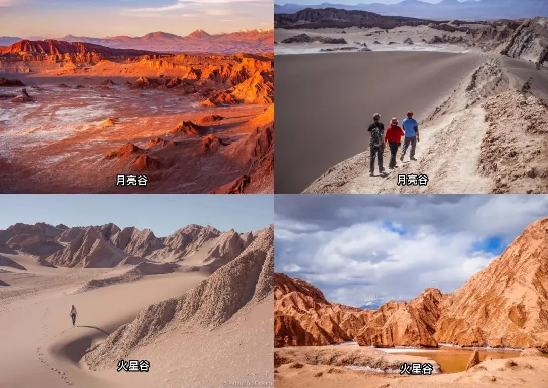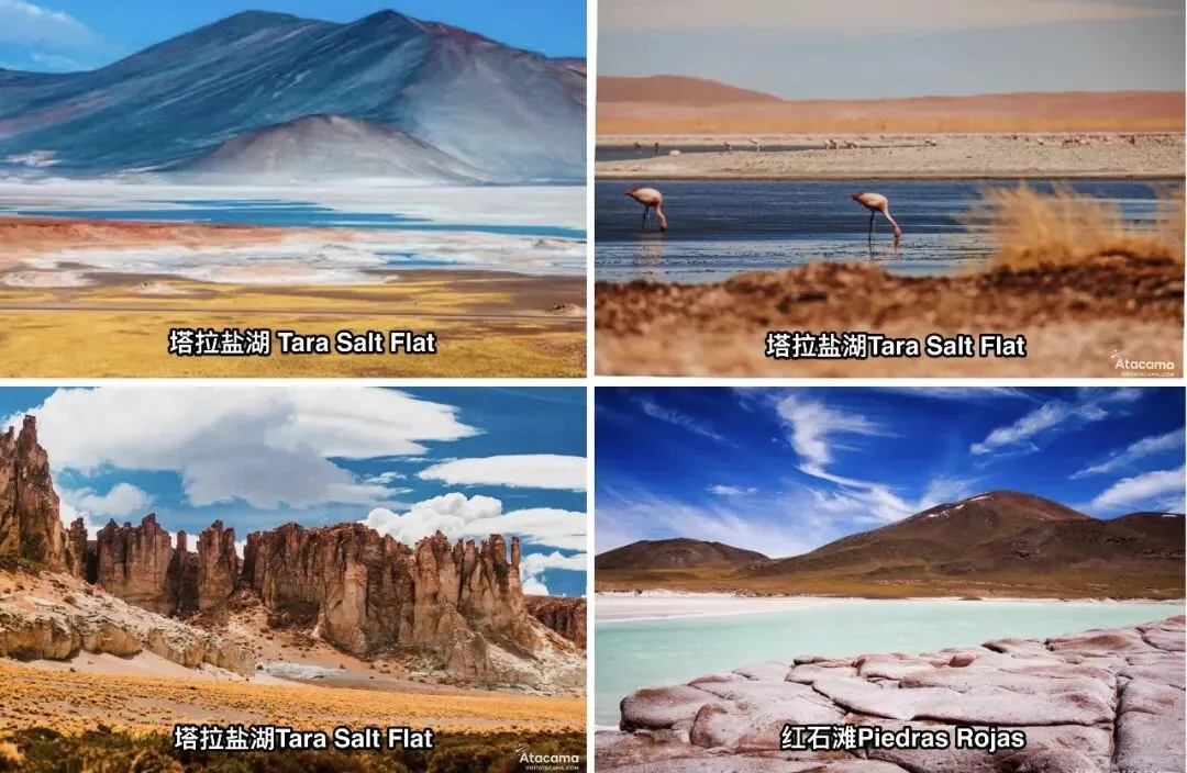▶地质奇观:月亮谷 (Valley of the Moon)、 死亡谷 / 火星谷 (Mars Valley / Death Valley)▶火山地貌:利坎卡武尔火山 (Volcán Licancabur)、塔提奥间歇泉 (El Tatio/Geysers Del Tatio)▶盐湖与火烈鸟:塔拉盐湖 (Tara Salt Flat)、红石滩(Piedras Rojas)、米斯坎蒂湖(Laguna Miscanti)与米尼克斯盐湖 (Laguna Minique)、巴尔蒂纳切隐秘盐湖 (Lagunas Escondidas de Baltinache)▶观星之旅 (Stargazing):沙漠观星和参观ALMA 天文台(Atacama Large Millimeter Array)月亮谷 (Valley of the Moon)、 死亡谷 / 火星谷 (Mars Valley / Death Valley)利坎卡武尔火山 (Volcán Licancabur)、塔提奥间歇泉 (El Tatio/Geysers Del Tatio)