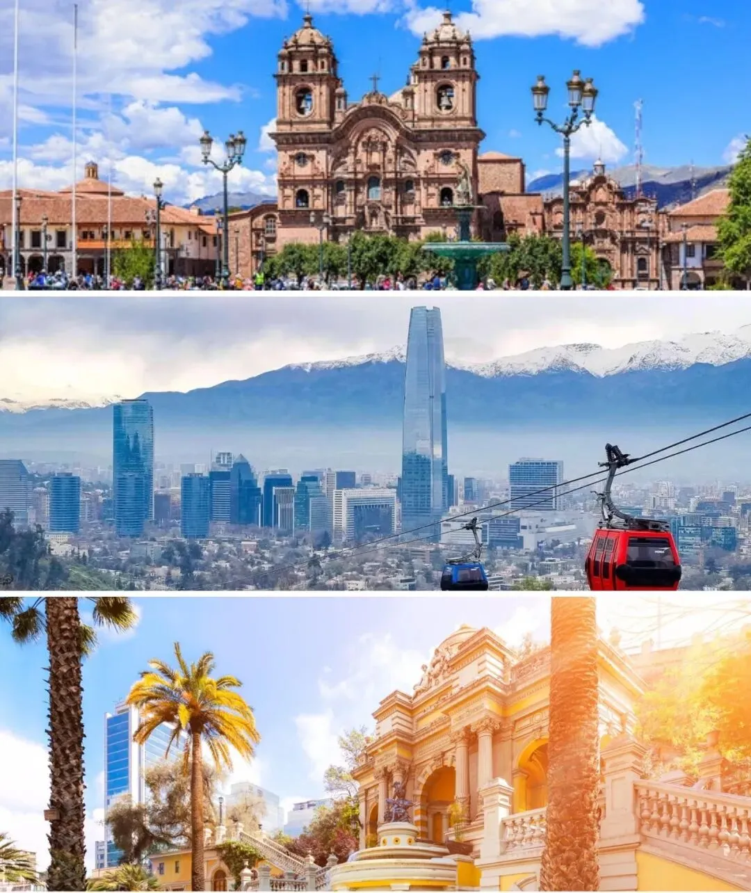 中部:圣地亚哥(首都)、瓦尔帕莱索(世界遗产小城)及葡萄酒谷地(Santiago, Valparaíso and Wine Valleys)智利中部包含了安第斯雪山下的首都现代都市、太平洋畔的艺术港口以及世界级的葡萄酒庄。