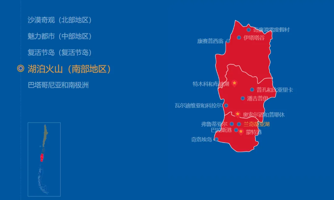 智利旅游局官方将它命名为森林、湖泊与火山区(Forests, Lakes and Volcanoes),它通常还被称为“智利湖区”(Chilean Lake District)。这个区域南北延伸2000 公里。——主要亮点: