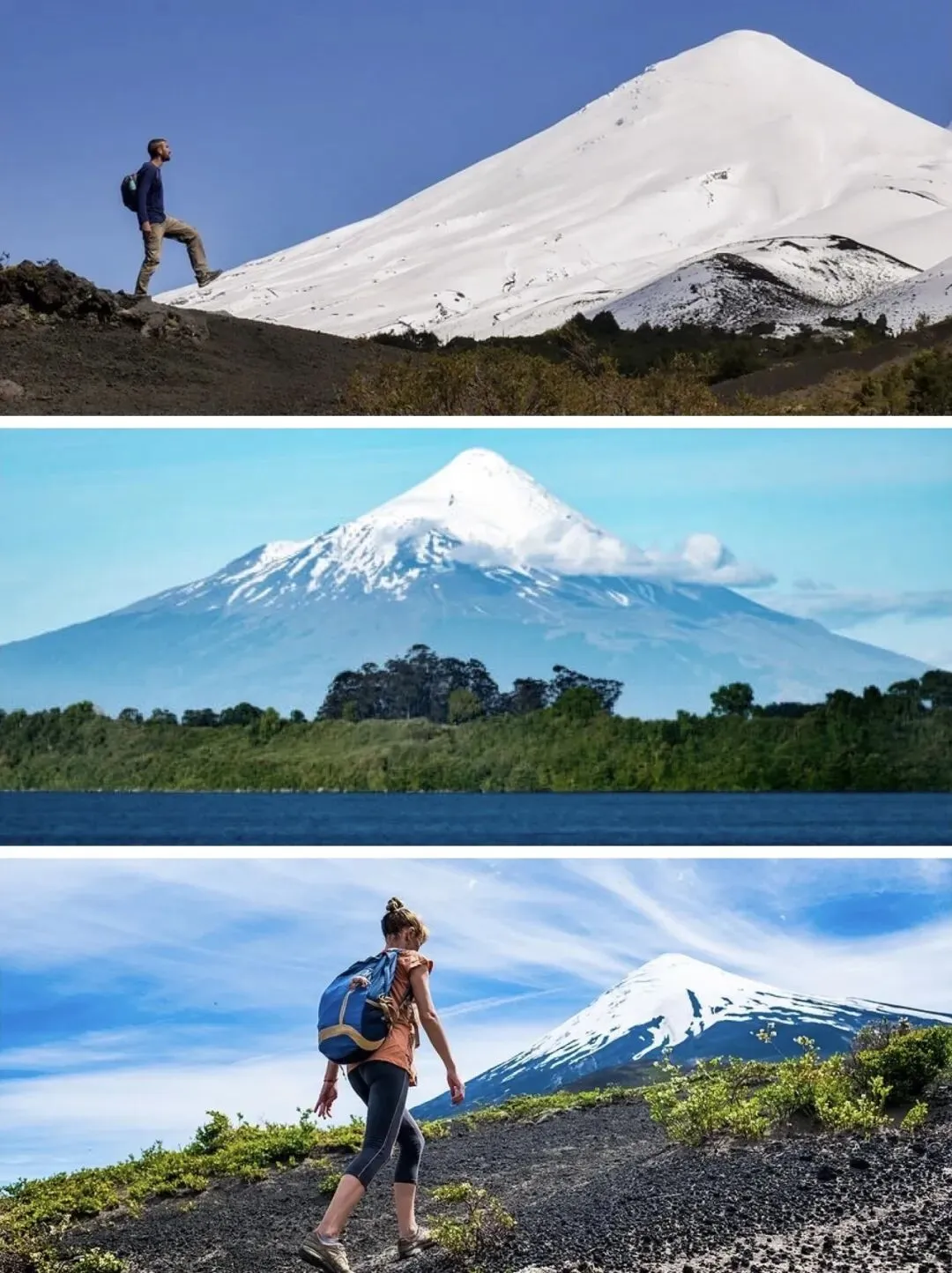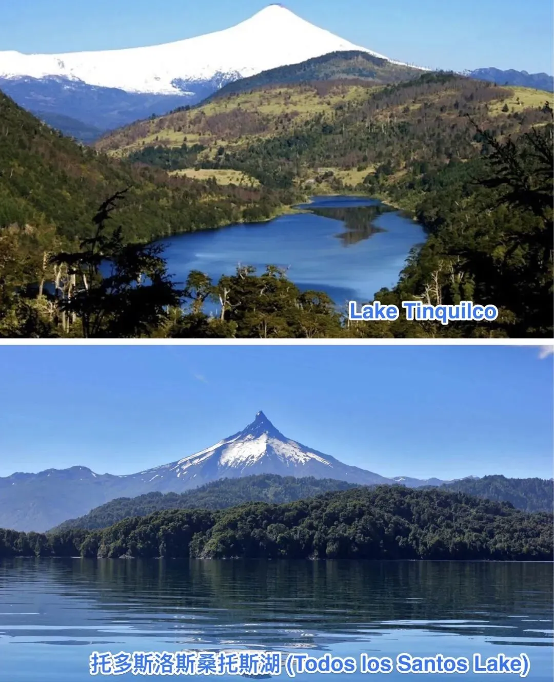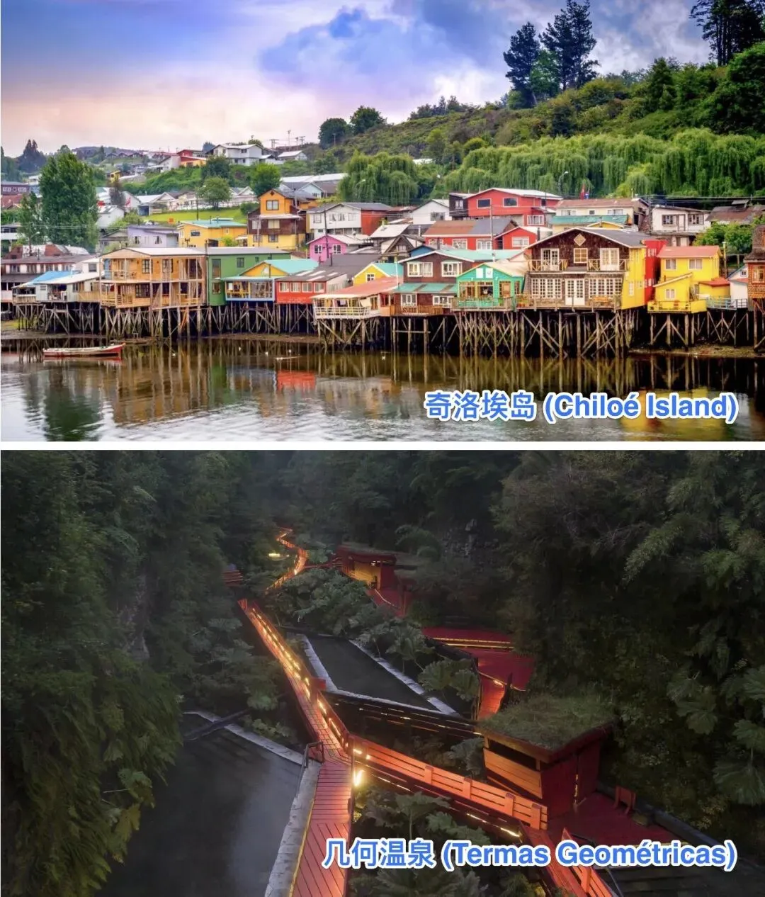 ▶巴拉斯港 (Puerto Varas):湖光山色小镇,以德式建筑闻名,可完美远眺奥索尔诺火山。▶蒙特港 (Puerto Montt):南部交通门户,区域首府,海鲜港口。▶瓦尔迪维亚 (Valdivia):河滨文化之都,智利啤酒之乡,拥有独特的德意志移民历史与热闹的河滨鱼市。(2)国家公园与顶级风景(火山、湖泊、森林、瀑布)▶比亚里卡国家公园 (Villarrica National Park):以维利亚里卡火山 (Villarrica Volcano) 为核心。(最近的枢纽城市:普孔 Pucón)▶孔吉利奥国家公园 (Conguillío National Park):由古老南洋杉 (Araucaria) 森林与亚伊马火山 (Llaima Volcano) 构成的史前地貌,被称为“现实版侏罗纪公园”。(最近的枢纽城市:特木科Temuco)▶韦尔克韦国家公园 (Huerquehue National Park):徒步胜地。穿行于南洋杉原始森林,纵览Lake Tinquilco等湖泊。(最近的枢纽城市:普孔 Pucón)▶文森特·佩雷斯·罗萨莱斯国家公园 (Vicente Pérez Rosales):核心景观为彼得罗韦瀑布 (Saltos del Petrohué) 、托多斯洛斯桑托斯湖 (Todos los Santos Lake) 、以及拥有完美圆锥体轮廓的奥索尔诺火山 (Osorno Volcano)。(最近的枢纽城市:巴拉斯港Puerto Varas)维利亚里卡火山 (Villarrica Volcano) 和孔吉利奥国家公园 (Conguillío National Park)韦尔克韦国家公园 (Huerquehue National Park)和托多斯洛斯桑托斯湖 (Todos los Santos Lake)彼得罗韦瀑布 (Saltos del Petrohué),背后的火山是奥索尔诺火山 (Osorno Volcano)▶奇洛埃岛 (Chiloé Island):探索色彩斑斓的吊脚楼、世界遗产木制教堂。▶几何温泉 (Termas Geométricas):智利最具设计感的温泉。交通 :先飞抵南侧蒙特港 (PMC) 或北侧特木科 (ZCO) 机场,然后自驾从北向南或者从南向北。行程:建议安排 4-6 天。以以上城市基地,辐射周边火山与湖泊。最佳月份 :11 月至次年 3 月(夏季),降雨最少。气候提醒:巴拉斯港降雨量极为充沛且全年分布均匀,年均降雨量通常在 1762 毫米至 2205 毫米之间。冬季(5月至8月)雨水更多,其中 6月为雨量之最;而最干燥的是1月和2月(依然会下雨)。