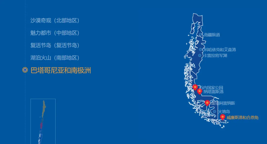 极南端:巴塔哥尼亚与南极地区(Patagonia and Antarctica)这是探险家的终极梦想之地。智利南部的巴塔哥尼亚地区,以百内国家公园为代表,集中了令人震撼的冰川、冰湖、花岗岩群峰和狂风。徒步是体验这里壮丽的最佳方式,自驾游览也很适宜。再往南,将抵达南美洲最南端的火地岛。▶纳塔莱斯港 (Puerto Natales):风景美丽的小镇,是前往百内国家公园补给的大本营。▶蓬塔阿雷纳斯 (Punta Arenas):麦哲伦海峡畔的历史名城,是进入南极的航空枢纽及企鹅观测中心。▶科海丘 (Coyhaique):是自驾南方高速公路 (Carretera Austral) 的核心补给与中转站。下图,纳塔莱斯港 (Puerto Natales)▶ 百内国家公园 (Torres del Paine National Park):智利的自然名片。以标志性的三座花岗岩塔、格雷冰川 (Grey Glacier) 及世界级徒步线路(W线和O线)闻名。(最近枢纽城市:纳塔莱斯港 Puerto Natales)▶ 基尔拉特国家公园 (Queulat National Park):以悬挂冰川 (Ventisquero Colgante) 著称。(最近枢纽城市:科海丘 Coyhaique)▶ 卡斯蒂略山国家公园 (Cerro Castillo National Park):被誉为“下一个百内”。(最近枢纽城市:科海丘 Coyhaique)▶ 圣拉斐尔潟湖国家公园(Laguna San Rafael National Park):巨大的冰川崩塌入海形成壮丽奇观(最近枢纽城市:科海丘 Coyhaique 或 Puerto Chacabuco)▶ 合恩角国家公园 (Cabo de Hornos National Park): 最南端的国家公园(最近枢纽城市:威廉斯港 Puerto Williams)▶大理石大教堂 (Marble Caves) :水蚀大理石洞穴。(最近枢纽城市:宁静河港 Puerto Río Tranquilo)