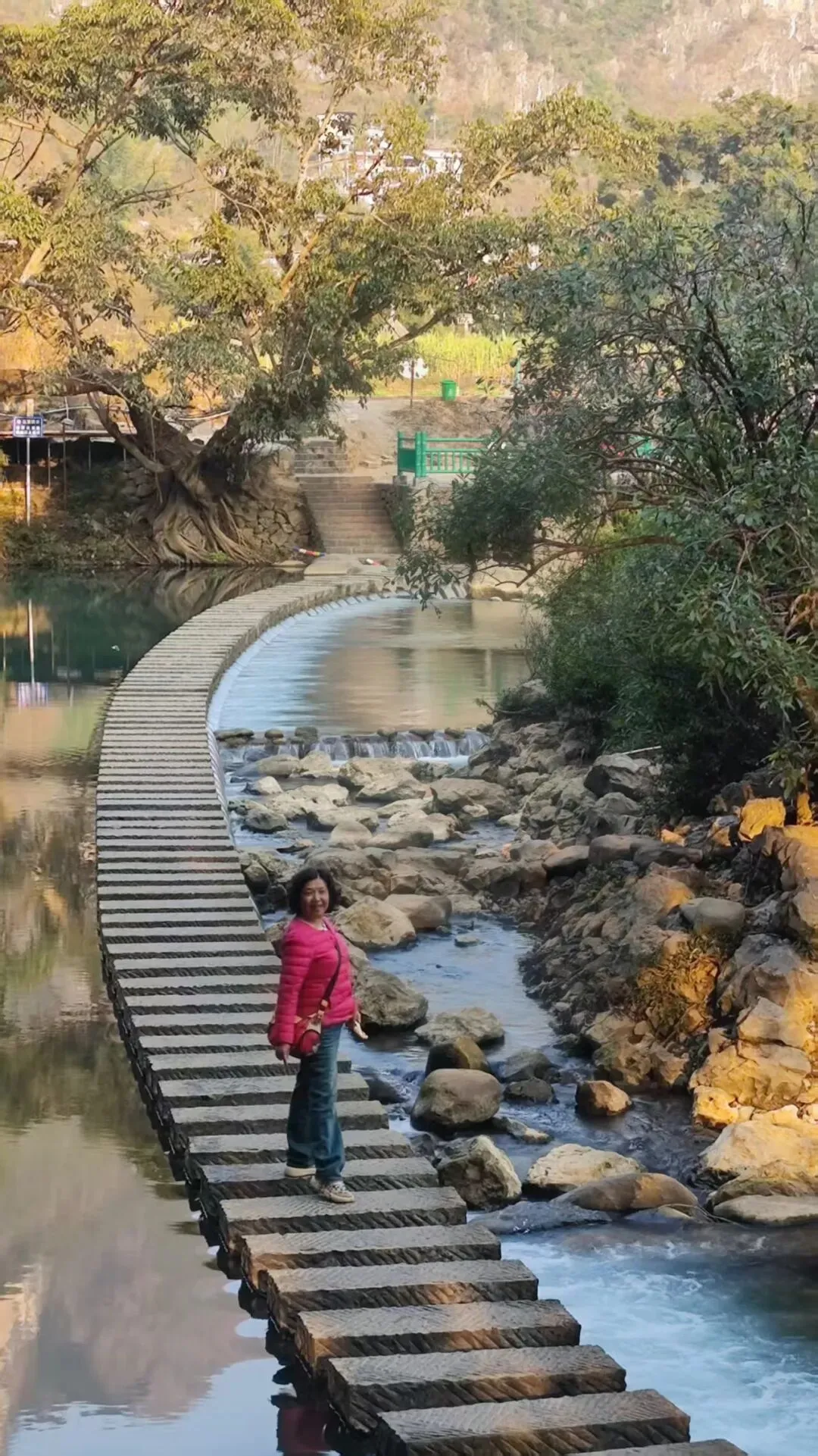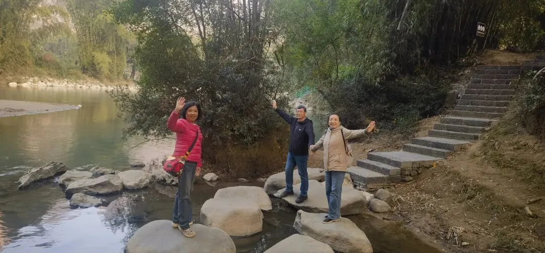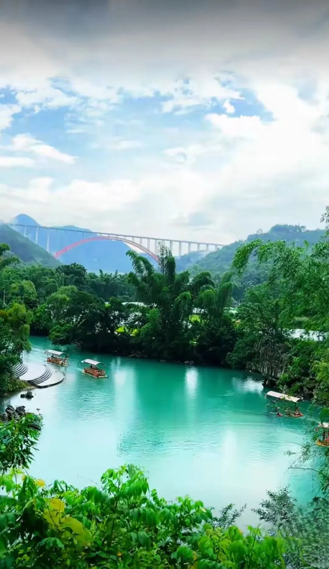 碧水涵光,古树遮阳。驾竹筏、划破翠琉璃千行。凤竹摇影,溶洞深藏。有天坑幽,响水洞,芭蕉凉。