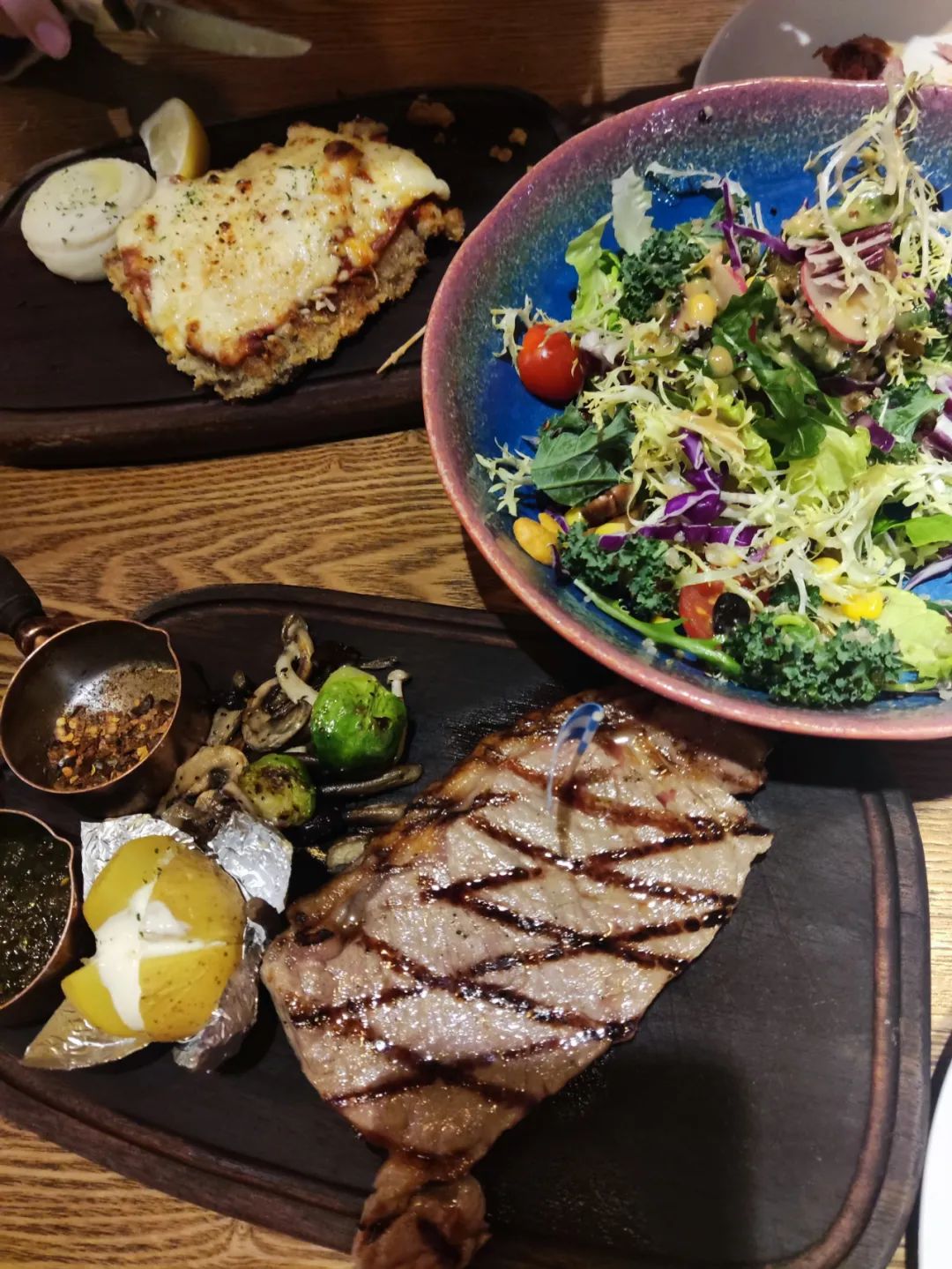 不得不说,阿根廷不愧是盛产香料的国家,牛排的酱汁不是黑椒或番茄,而是一直我不认识的菜。看着像咸菜,吃起来开始一点点的酸然后是能回味很久的香(有一点像锯松木后的香味)。牛排也煎地很嫩,我从来没吃过这种味道的调料,第一次尝试非常惊喜。