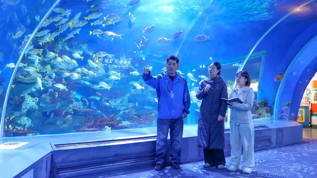 坐落于万平口的日照海洋公园面朝大海,背靠东夷小镇,以绝佳区位吸引游客前来体验海底世界的神秘。旅游向导正化身网络直播,穿梭在各个场馆之间,在线热情推介游玩攻略和活动信息。