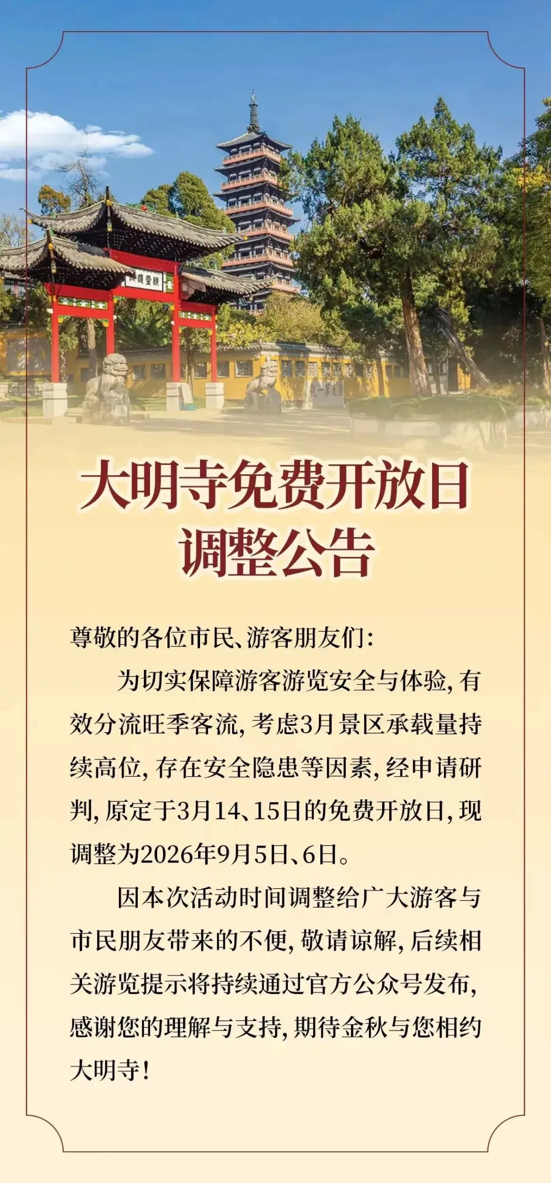 扬州大明寺最新公告原定于3月14、15日的免费开放日