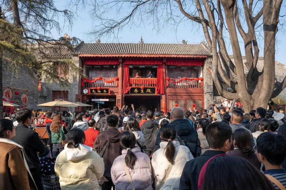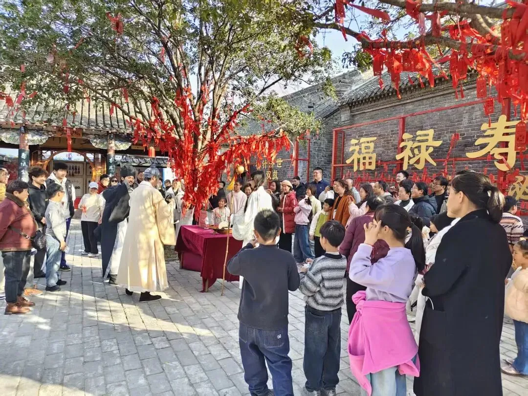 观景平台上,非遗五禽戏轮番展演,跟着大师一起练习,强身健体;庵门口的新春养生粥暖胃暖心,元化草堂的一元福寿茶,喝出一整年的健康长寿。