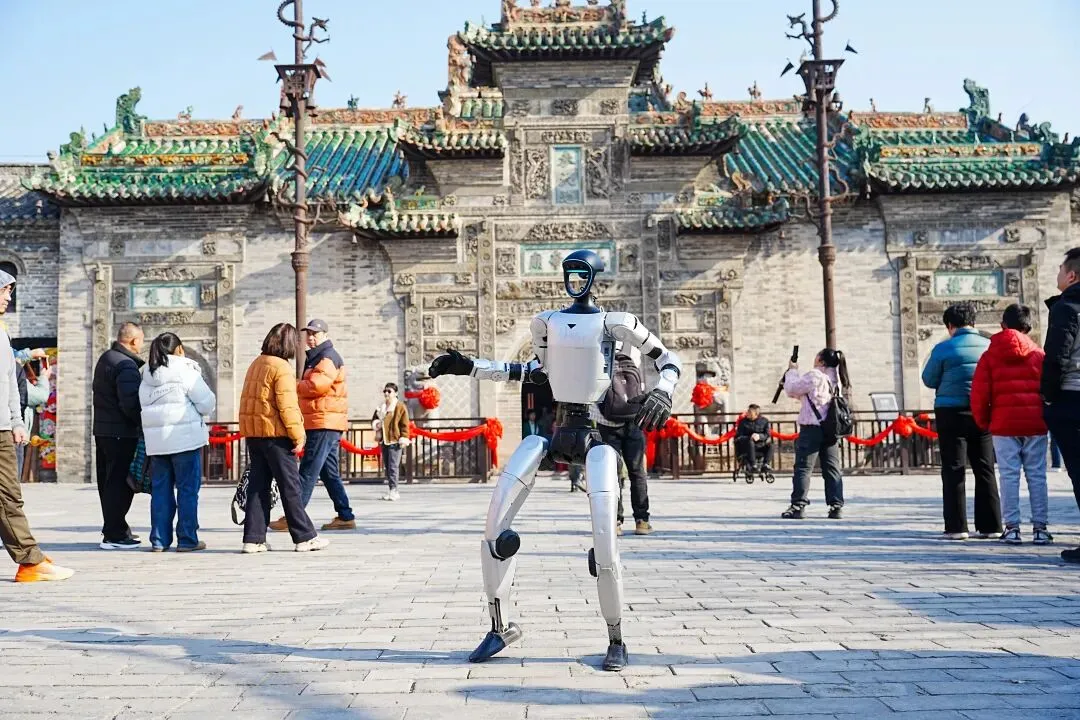 花戏楼广场上演“传统与科技”的梦幻联动,春晚同款机器人惊艳亮相!呆萌机器人身着民俗服饰,与游客欢乐互动、齐拜大年,科技感十足的舞蹈引得全场欢呼,带孩子来感受别样年味!