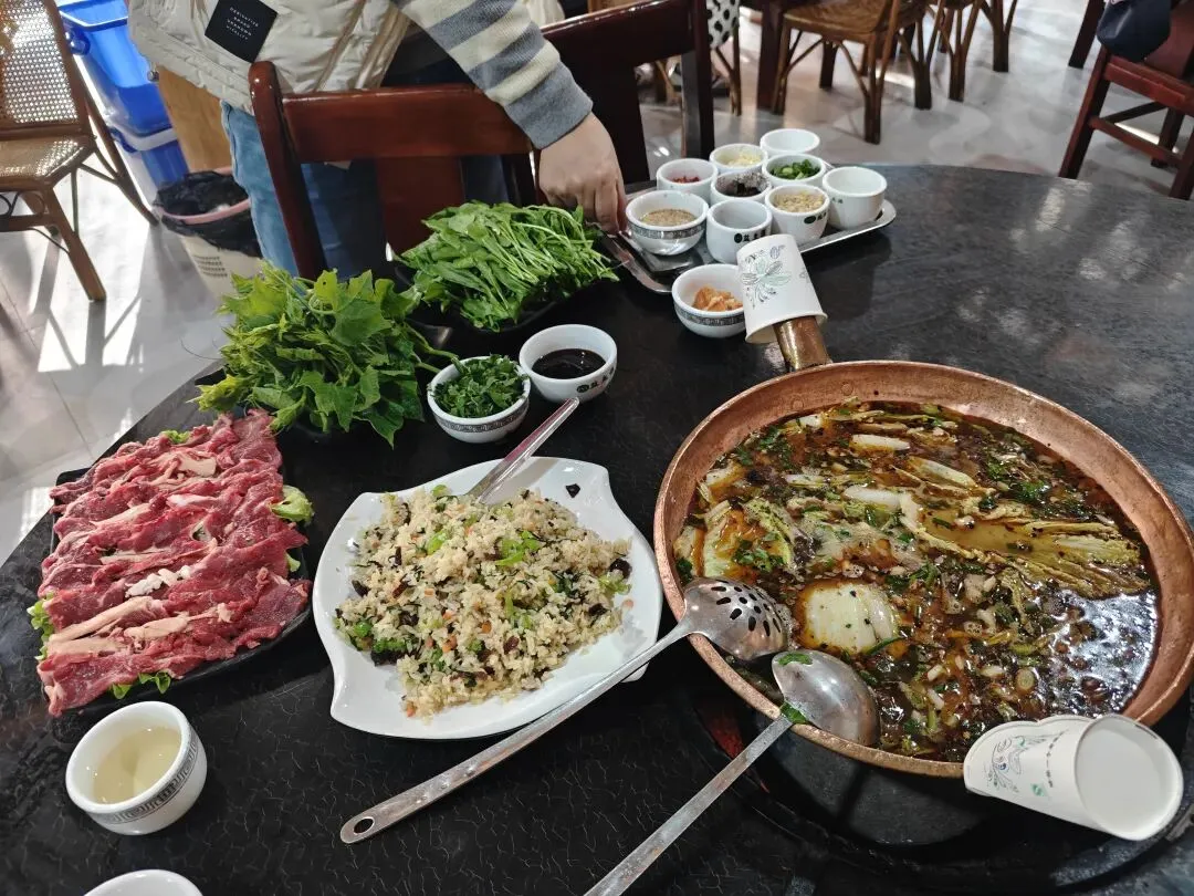 马东铜瓢牛肉非常好吃,137元吃撑晕厥。内容物有熟牛肉,生牛肉,南瓜,萝卜等,可以回想起十多年前在云南吃的牦牛肉,很有牛味,不用调料也很美味。青菜是云南的特色,无论吃什么青菜都又甜又脆。